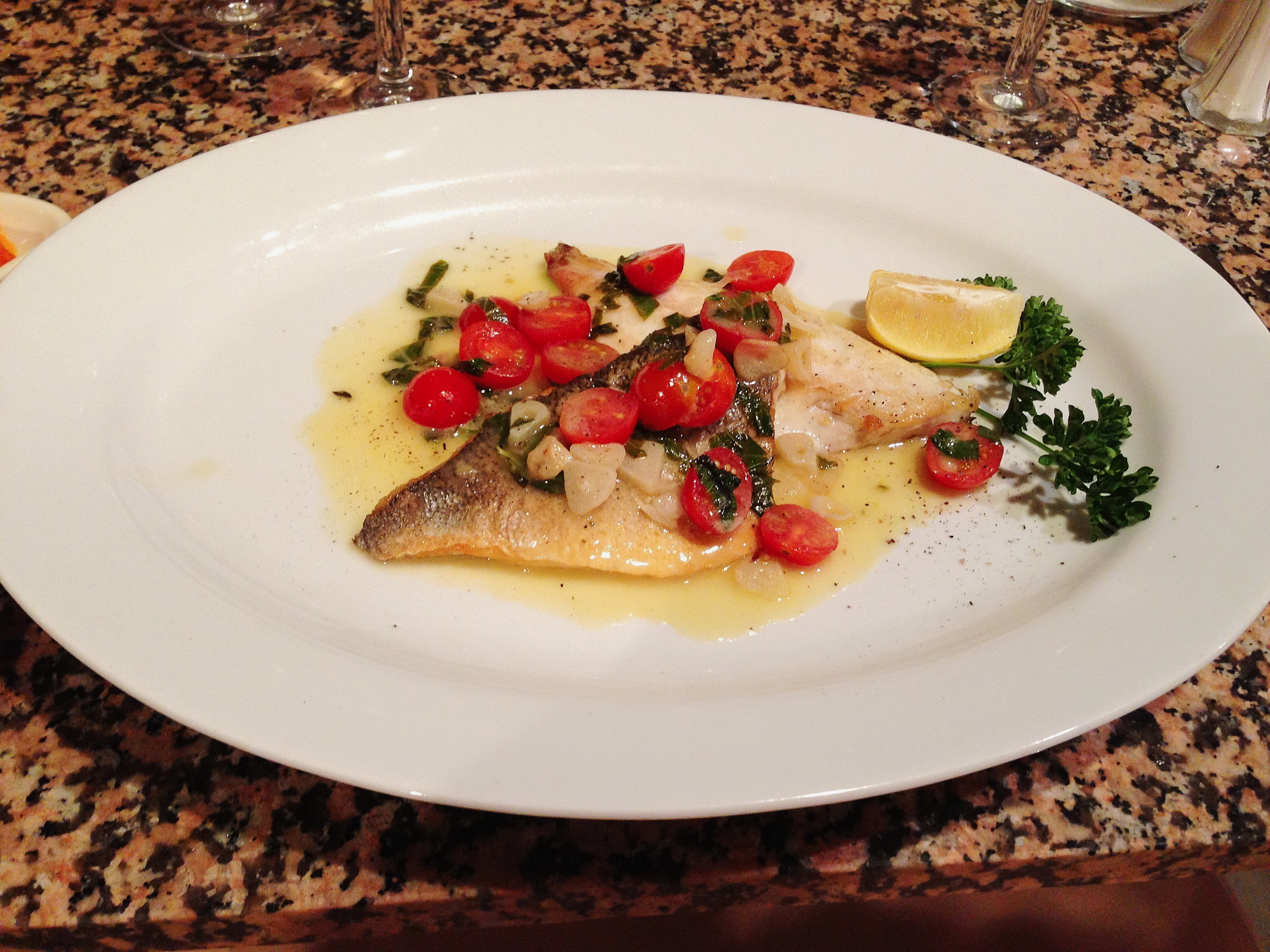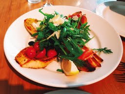 The crostini starter (to share) was nice enough: sort of a garlic bread version of a four seasons pizza. The four slices of bread were thickly sliced, crispy on the edges and generously topped with “bruschetta” (which turned out to be cherry tomatoes, black olives and garlic), parma ham (which was generous to a fault), smoked salmon with mascarpone, and a very small strip of goat’s cheese. This came with a big pile of rocket and some parmesan which was slightly tough, as if it had been sliced then left out to dry. The rocket was a sad thing which seemed to be there for no other reason but to fill space: undressed and a little dishevelled, a few brown bits, a few tough leaves. I like rocket as much as the next person, but the next person would have left this rocket, and so did I.