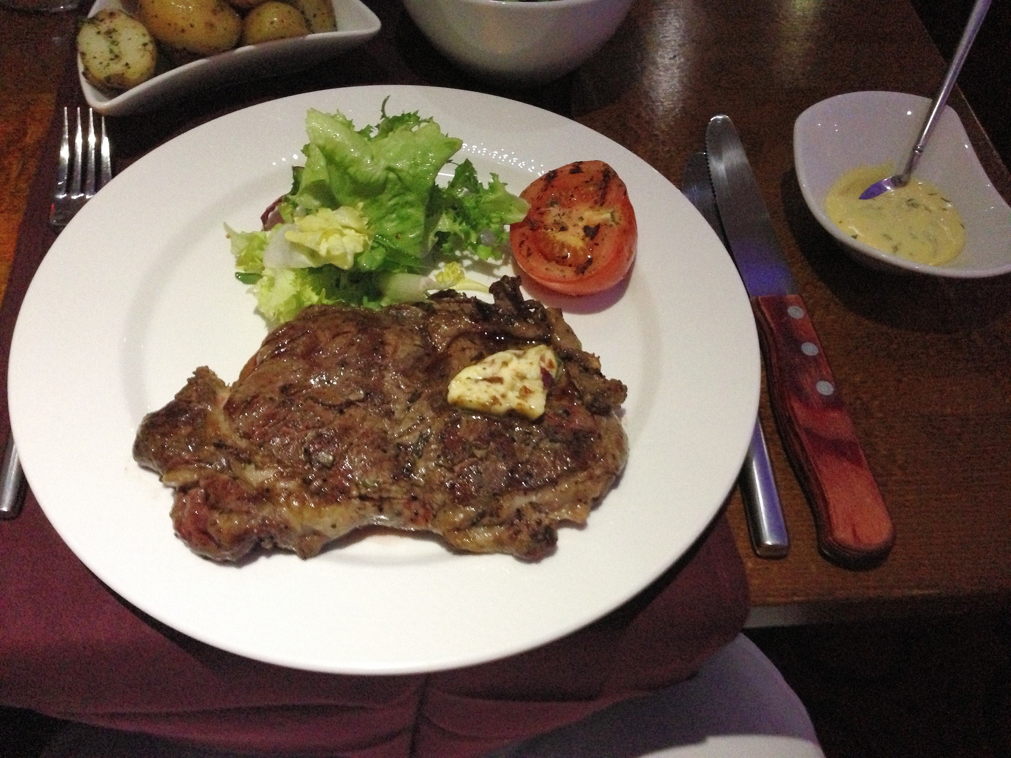The starters were both squarely on the border between underwhelming and downright disappointing. The “smoked haddock pot, rosemary and garlic” was not at all what I expected. I thought it was going to be a type of potted haddock affair, all butter and spices. Instead, I got a miniature fisherman’s pie, with a thick layer of haddock, mashed potato and a cheesy topping. There was no sign of rosemary or garlic anywhere, or indeed any seasoning. Or flavour, save for the smokiness of the haddock. The board (it’s always on a board these days, isn’t it?) had a little white jug with a cream coloured sauce in it. I dipped the tines of my fork in to try and taste it and it tasted of nothing. When I asked the waitress to remind me what it was she revealed it to be “butter sauce”. No sign of the rosemary or garlic there, either, more beurre blank than beurre blanc. It was almost too bland to criticise – a fitting accompaniment to the Mumford And Sons, Coldplay and Adele being pumped through the speakers at a volume I wasn’t personally happy with (although, in my case, that’s any volume above “muted”).