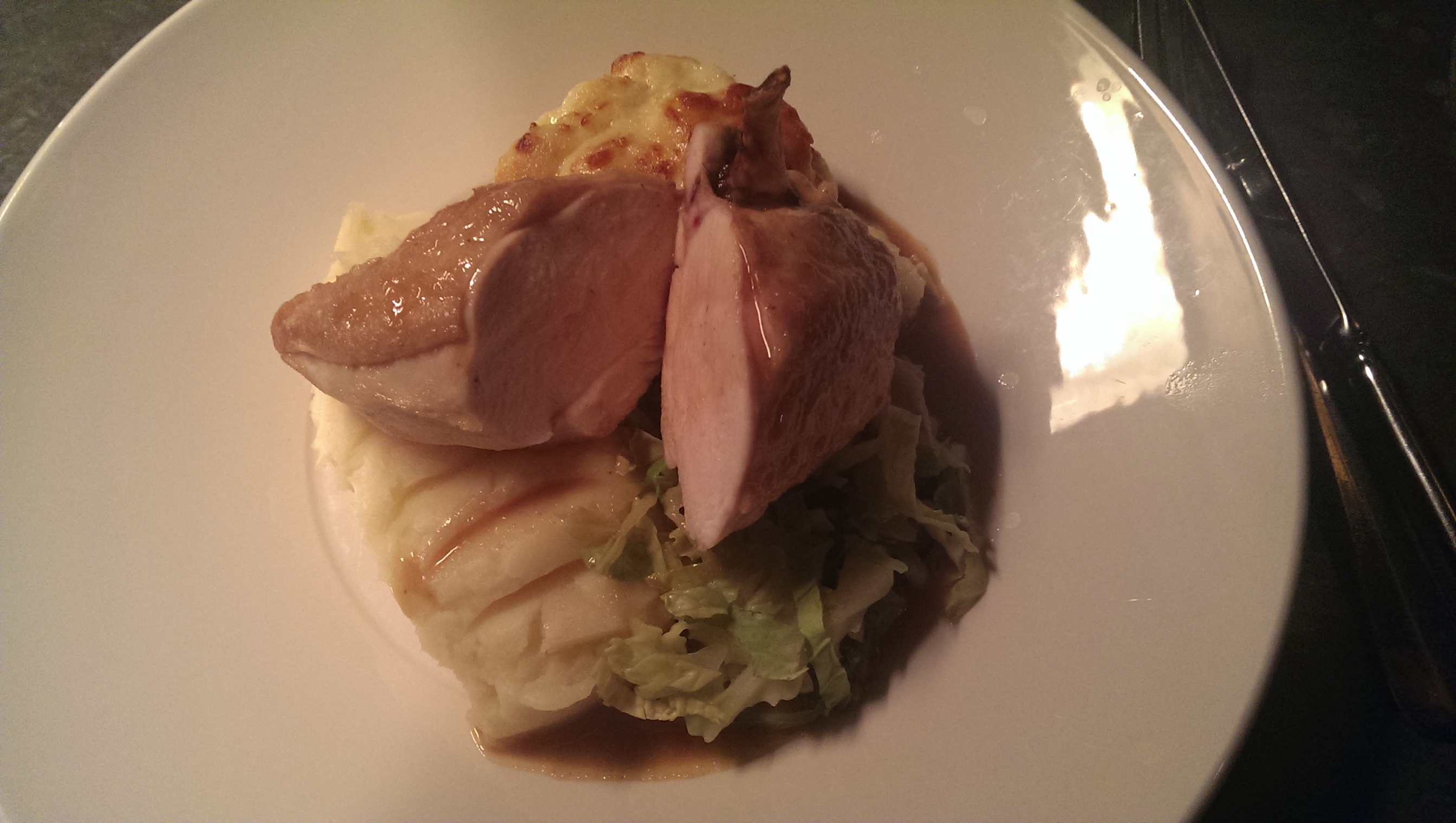 The mains were no better. “Pan fried chicken breast, parsnip mash potato, St James cabbage, cauliflower cheese and cream chicken sauce” was pretty much exactly that. The chicken (as you can see from my picture) was massive – I think it had been working out – with a limp skin and no signs of any seasoning. The cabbage was nicely cooked, in fairness, and did indeed have creamy sauce but it didn’t taste of chicken. I’m not sure the chicken did either. The parsnip mash potato was bland and lumpy, neither mashed nor containing any discernible parsnip. All in all, the overall effect was that of eating average food with a heavy cold: nothing tasted of anything.