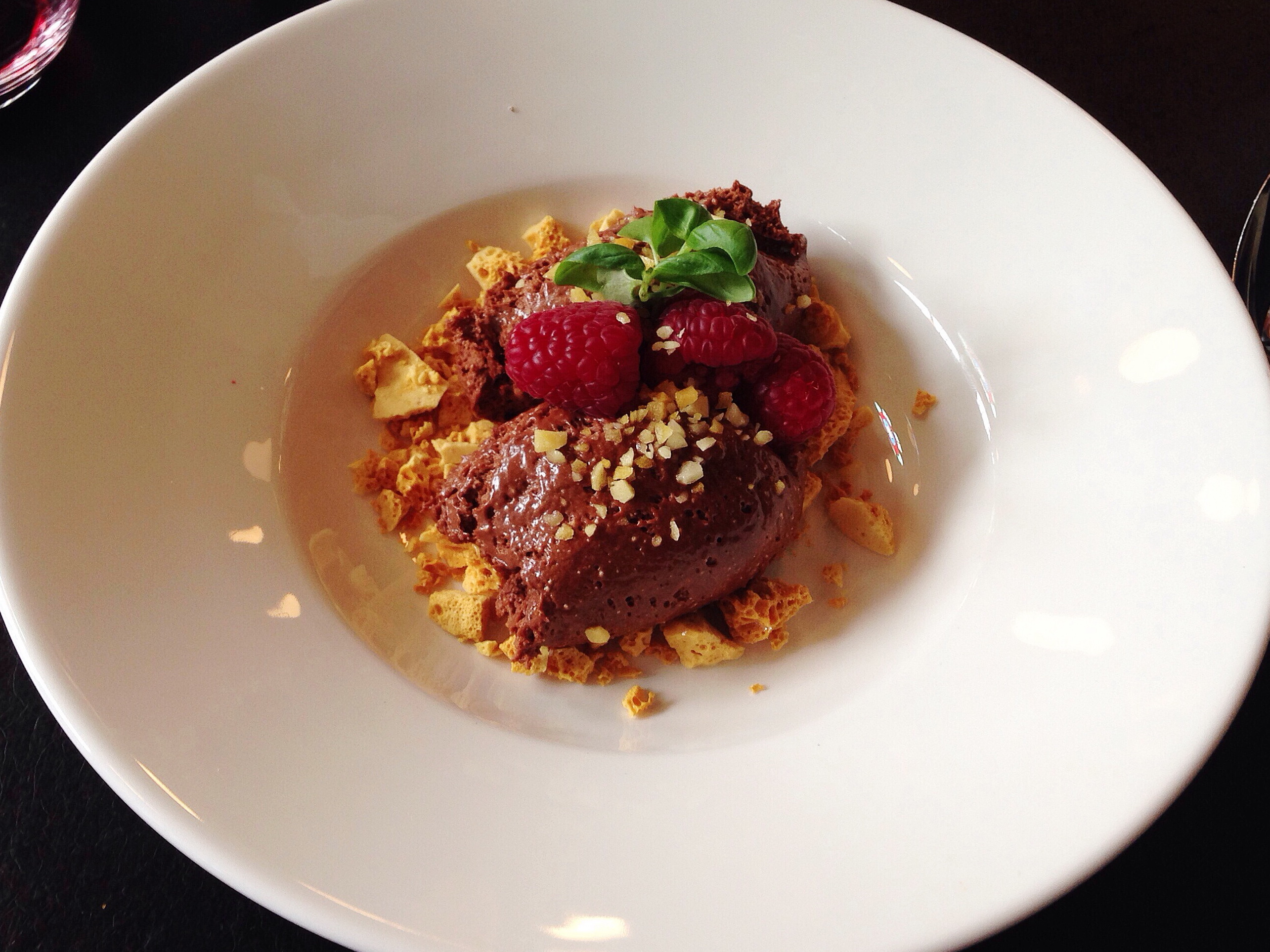 Pricing at Bel is all over the place. The starters are an expensive bunch – most around the eight or nine pound mark – and the mains vary widely from the reasonable (my stew was twelve pounds, as is the fish pie) to the punitive (the idea that two people would really fork out sixty-six pounds to share a rib of beef on the bone is either hopeless optimism or exploitation, not sure which). But the desserts are all a consistent six pounds. The Valrhona chocolate mousse with honeycomb and popping candy was indifferent stuff. I got a lot of sweetness and no cocoa, which meant this either wasn’t Valrhona or was Valrhona hopelessly maltreated. The honeycomb just added to the relentless sugariness, as did the popping candy, and the three meagre raspberries didn’t have enough sharpness to put up a fight against it.