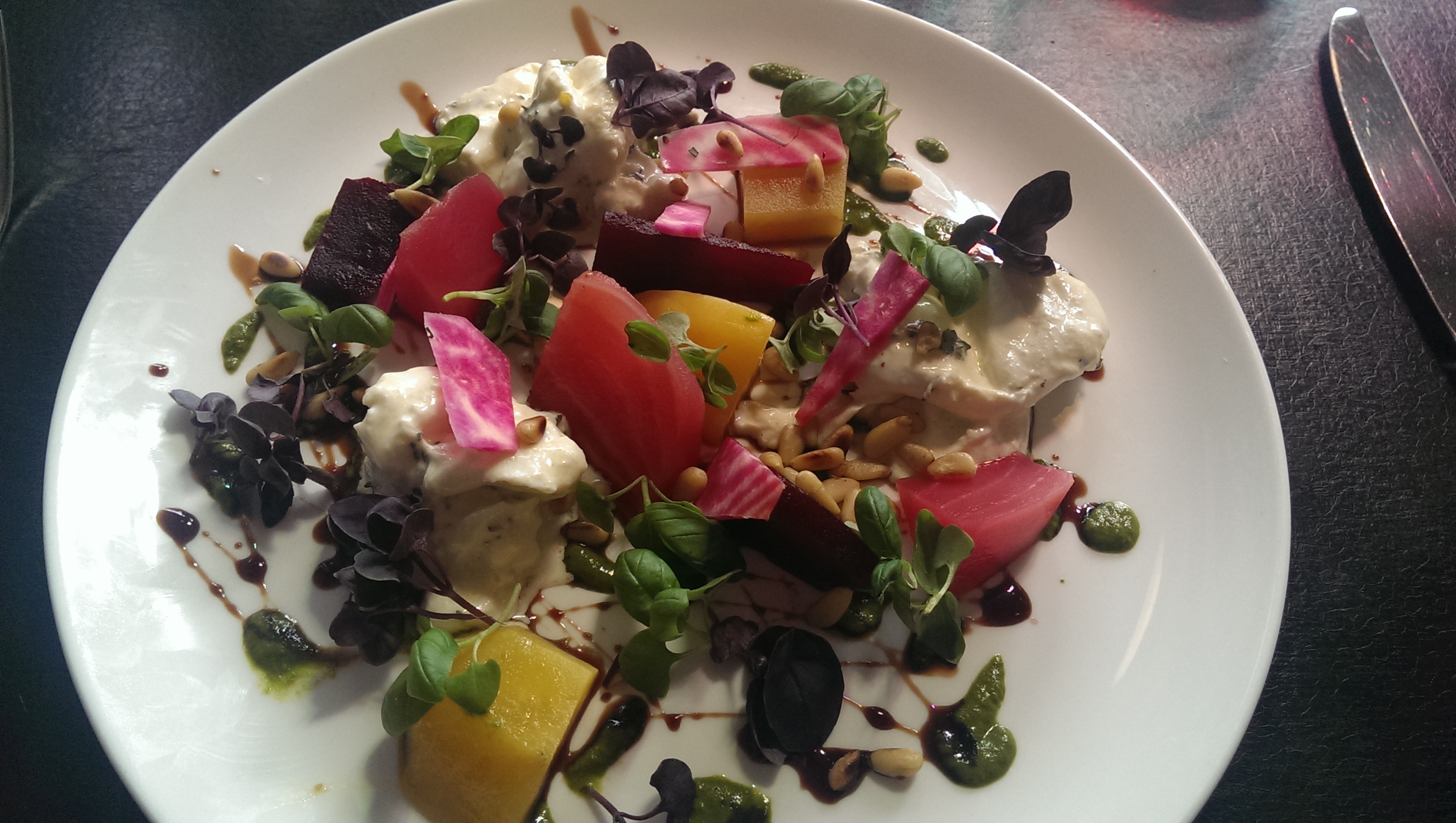 The burrata, on the other hand had been treated so badly that I fear the chef had never seen one before. It looked as if had been torn to pieces by an angry mob before being studded with slightly chewy thyme leaves and strewn on a plate with far too much beetroot. Sure, there were four types of beetroot and a few toasted pine nuts, but what should have been the centrepiece of the dish really wasn’t. Where I expect a burrata to be a soft, yielding pouch of rich, creamy delight this was a tough, abused poor relation. I don’t know what had been done to it prior to it reaching my plate but it had grown a thick skin to make up for it.