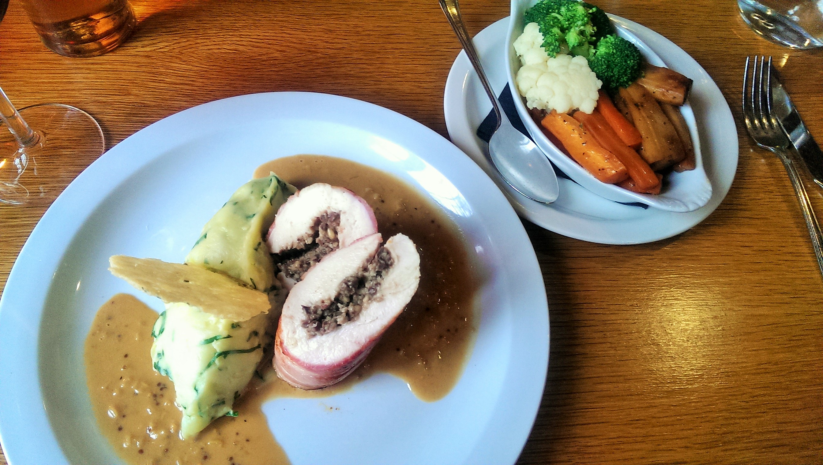 On to the mains, then. The standout here was chicken Balmoral: stuffed with haggis and wrapped in bacon, served with rumbledethumps (Scotland’s answer to colcannon) and a whisky and mustard sauce. The chicken was spot on – still moist but cooked through – and the haggis had that earthy, peppery taste I adore: I know it isn’t everyone’s cup of tea but I love the stuff, and you don’t see it on menus often. There was a side dish of vegetables that appeared to come with most of the mains – roasted carrots and parsnips, steamed broccoli and cauliflower. The parsnips in particular – all sweet and sticky-soft – were fabulous, but all of the vegetables were well cooked, not boiled into mushy oblivion. The sauce was more mustard than whisky, but worked beautifully with everything. The only disappointment was the bacon – it wasn’t cooked anywhere near enough and much of it ended up discarded on the side of the plate, pale pink and rubbery. Maybe that’s the price you pay for tender chicken.