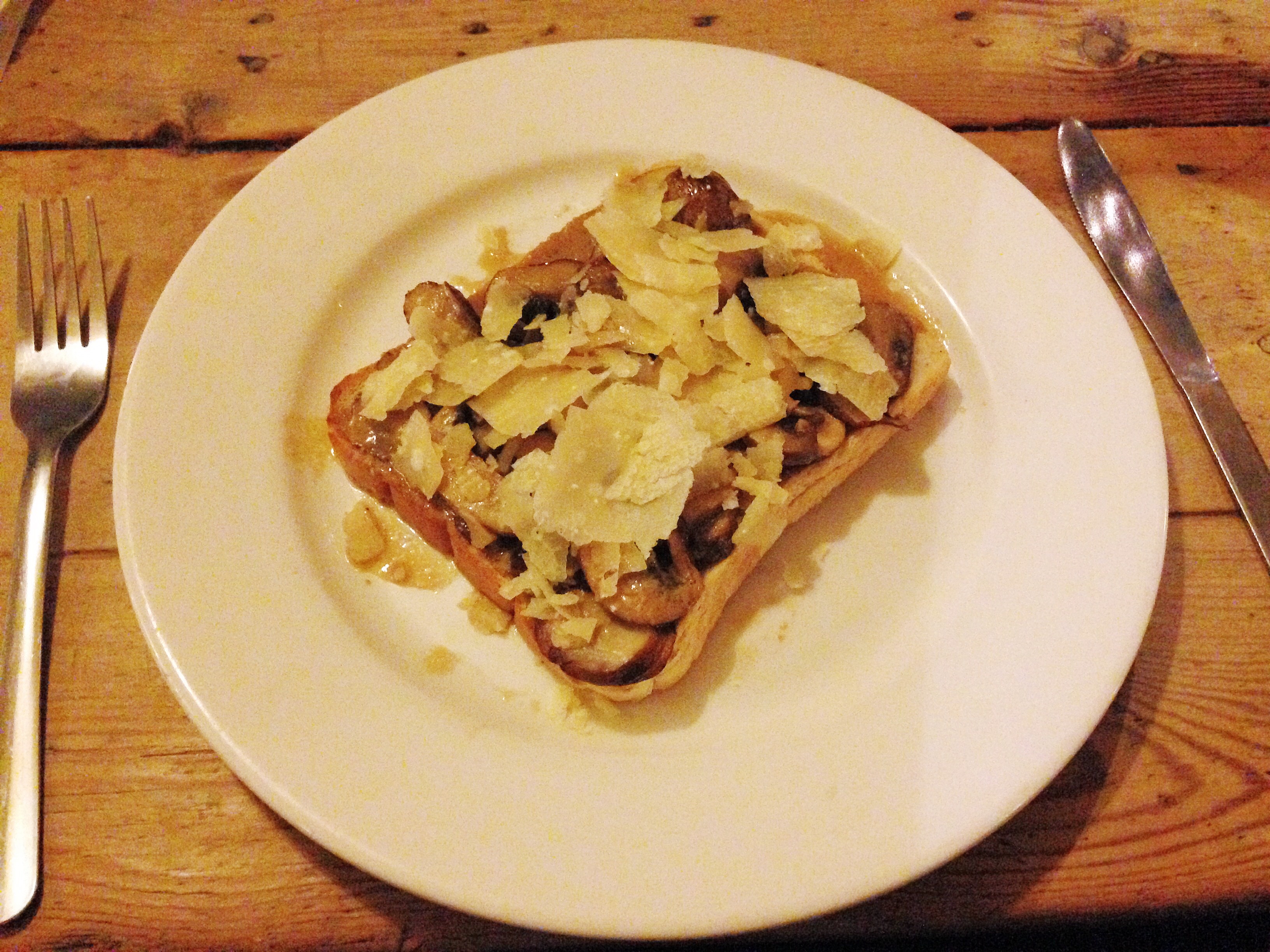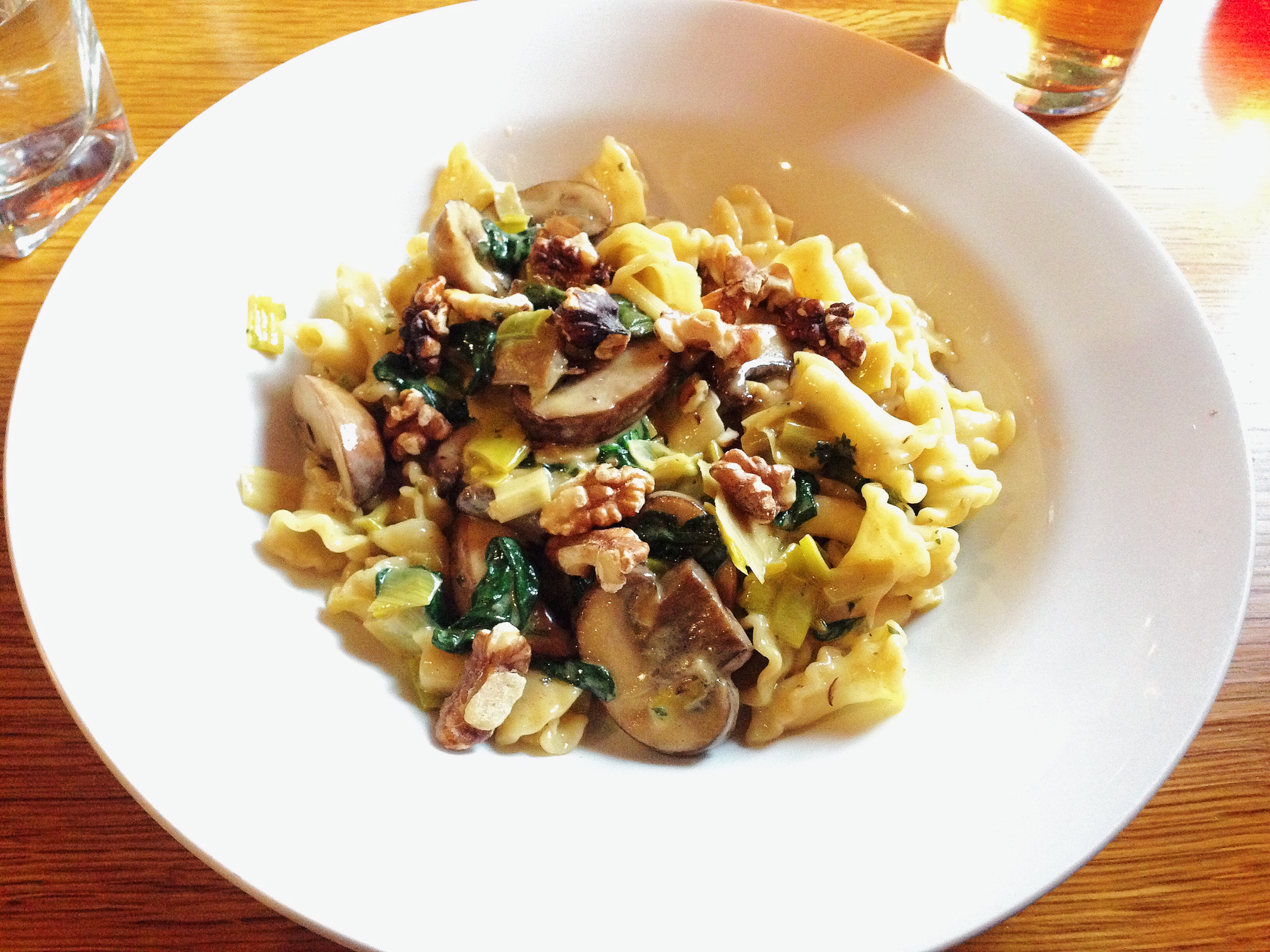 The other main was that unusual thing, a vegetarian dish I actively wanted to order: blue cheese and chestnut mushroom pasta with leeks, baby spinach and toasted walnuts. I could see literally nothing to dislike about this in theory, but again the execution was disappointing. The pasta – campanelle, I think – was good, the right shape to pick up the sauce and cooked only slightly further from al dente than I’d liked. The leeks were soft and sweet. The chestnut mushrooms were good, although they’d have worked better chopped finer. The toasted walnuts added crunch. So much potential from the supporting cast, but the star didn’t turn up: there wasn’t enough sauce, and what sauce there was clung to the bottom of the dish as if in hiding. I was expecting that rich tang of blue cheese, little bombs of salt scattered throughout, but it was so bland it was hardly there at all. It was inoffensive, a blue cheese dish for people who don’t really like blue cheese. But really, who’s the target market for that?