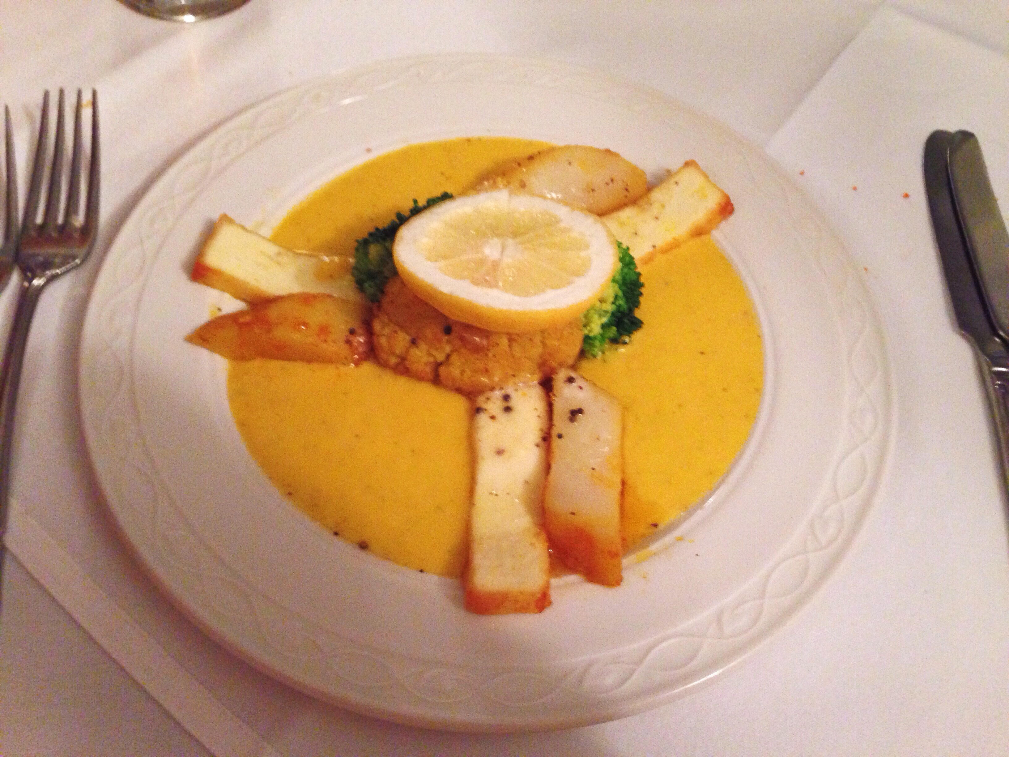 The least successful of the starters was the trout two ways (line caught Avington rainbow trout, for any provenance buffs out there). Half had been cured in vodka, little beautifully-coloured strips arranged in a whorl. It was pretty but insubstantial. The other half, hot tea smoked, was served on a little smudge of spinach pureé and I liked it but I didn’t love it – it was powerfully smoky but that flavour wasn’t as deep or complex as I’d hoped it would be and, like the cured trout, it was almost over before it began. By serving it two ways, it felt like neither one thing nor the other: I admired the technique a great deal, but it felt a little unrewarding for six pounds (at the risk of sounding like a heathen, I would have liked some bread with it, but there wasn’t enough of it to put on bread anyway).