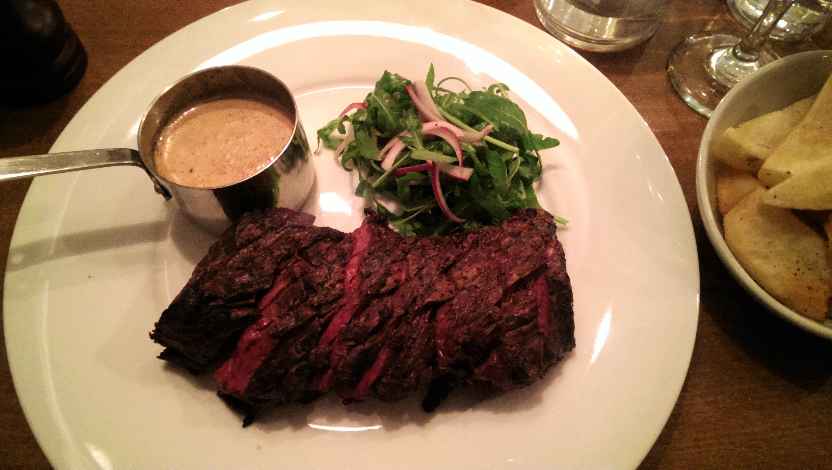 When ordering the waitress asked what sauce I wanted (blue cheese, red wine or peppercorn) and so I also had a little copper saucepan of peppercorn sauce. This was really lovely but I didn’t find out until the bill arrived that I’d been charged nearly three quid for the privilege. Now, I don’t mind paying extra for a sauce but I definitely felt like this was a little sneaky – there was no mention of the sauce on the printed menu (there is on the website, curiously) and the waitress didn’t say that there would be a charge, so I felt a little hoodwinked. Overall it pushed the cost of the dish over the twenty pound mark, and therein lies the real problem: onglet is a cheap cut, and for that money I could have had better meat from CAU – a little less of it, maybe, but better quality and cheaper.