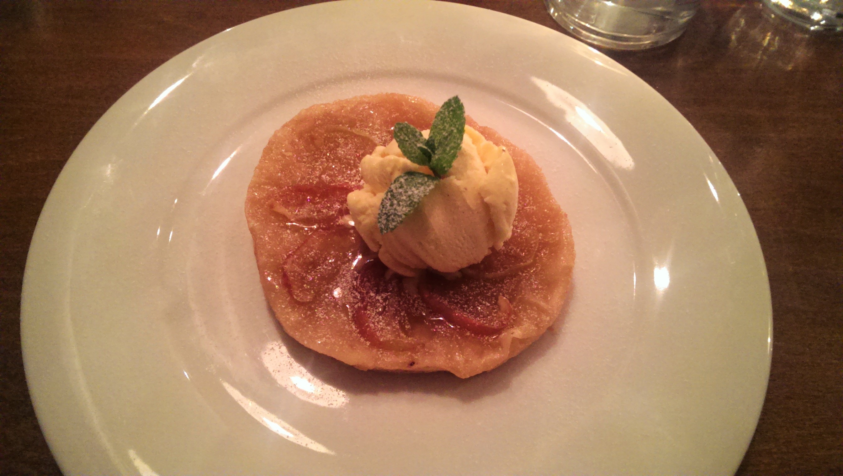I can’t quite remember why we ventured onto desserts after eating so much steak, but venture on we did. Tarte tatin is one of those French classics that’s difficult enough to make at home that I’d never bother (that’s what restaurants are for). Truth be told when it arrived I wondered if the chef had ever seen one before, let alone cooked one. It was the oddest looking tarte tatin I have ever seen; eight or nine thin slivers (not slithers, for the record: why do so many restaurant reviewers get this wrong?) of unpeeled apple on a pastry base with a caramelised coating and a scoop of vanilla ice cream. If anything, my photo makes it look more generous with the apple than was actually the case. To my shame, I still ate it all because – as everyone knows – pastry plus sugar equals tasty. But it was an amateurish kind of tasty.