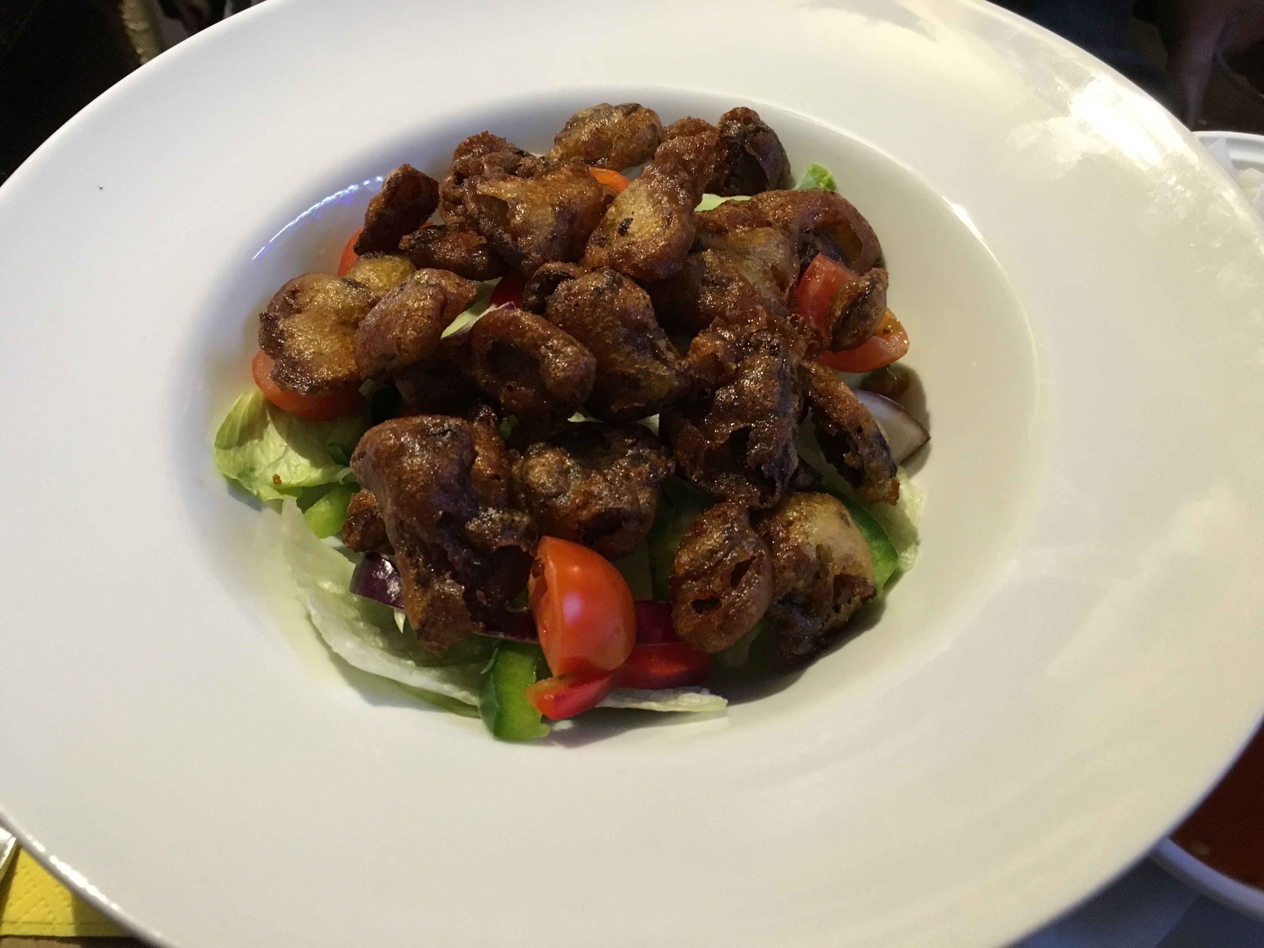 Smoked mushrooms in cider batter sounded so perfect that I really wanted to try it. And when it arrived it got so close to really good that I was almost prepared to overlook the flaws. The mushrooms were so smoky that I could nearly forget how small they were, the cider batter so crunchy that I only just remembered that they maybe could have done with being served hotter. The sweet chilli sauce was so thick and tangy that it took my mind off the incongruous bowl of dried coconut flakes on the side which didn’t go, or the undressed salad which was mainly iceberg lettuce. For seven pounds I think I expected slightly more, but on the other hand I was in a lovely pub trying smoked mushrooms, and that doesn’t happen very often.