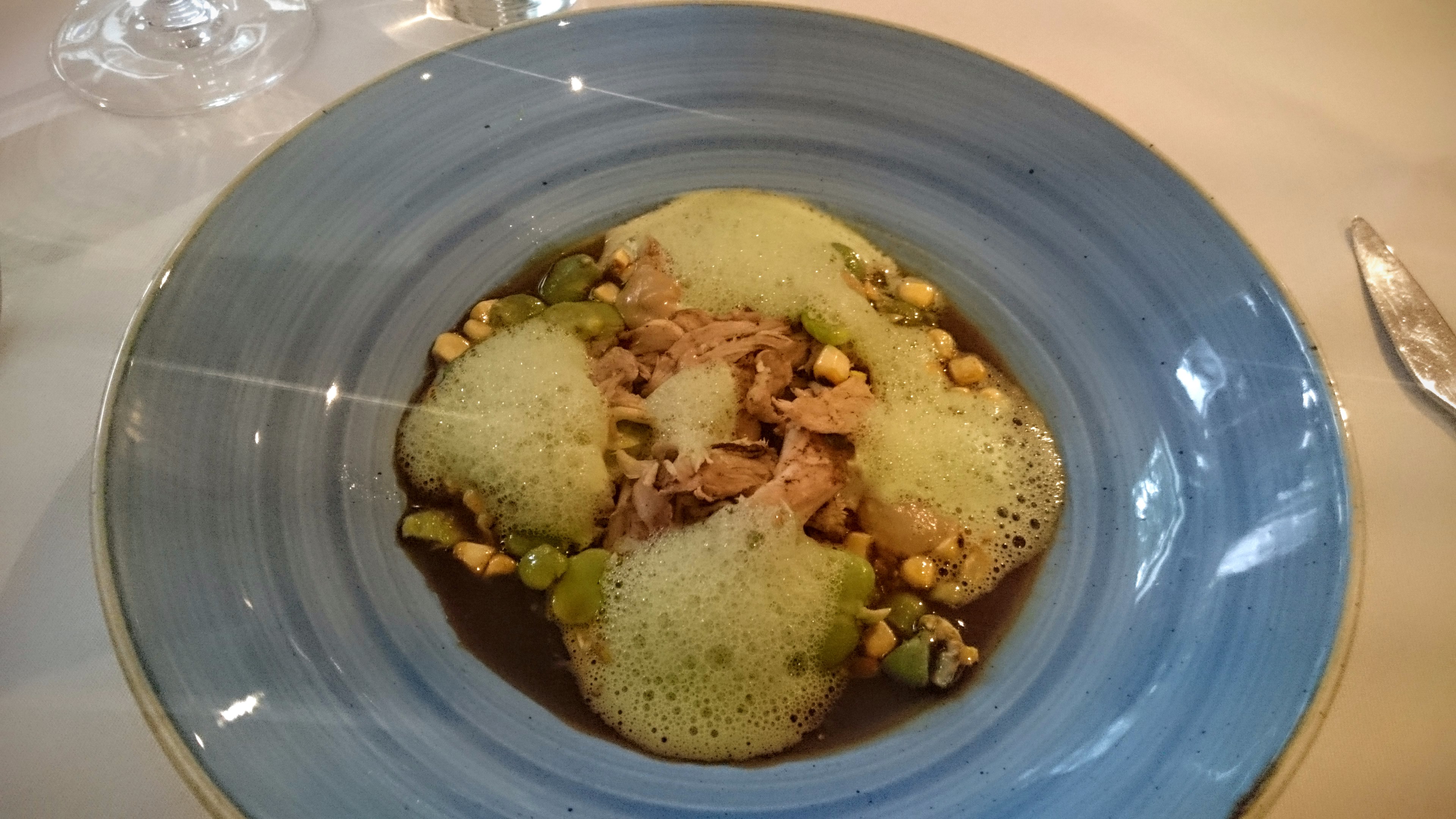 I said the menu was full of little touches. Have a look at how they described our first starter if you don’t believe me: “Nutmeg and Thyme Confit Chicken Thigh, Chicken Broth, Crisp Skin, Wild Mushrooms, Broad Beans, Charred Corn & Spinach Foam”. Sounds good, don’t you think? And generally speaking it was. The thigh meat, soaked in the broth, was like the wonderful bit at the end of a roast dinner when you get to the last shreds of chicken, falling apart, soaked in rich salty gravy. Intensely good. The wild mushrooms were served as little splodges of purée that added creaminess but were otherwise a little lost. The broad beans – very large, very green, beautifully fresh – were top-notch. Only some of the corn was actually charred, but it added a nutty, chewy texture, nonetheless. No crisp skin, either, which is a great shame as they’re always two welcome words on any menu I look at. Last of all, the spinach foam added great colour (thankfully not too reminiscent of frogspawn) but not a lot else.