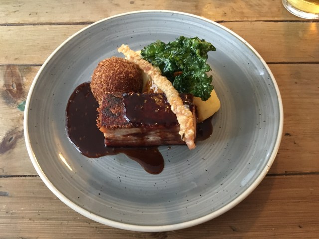 So, not a home run on the starters but the kitchen really hit its stride when the mains turned up. I’d asked at the bar for recommendations and as a result I’d chosen the Cajun pork belly, not something I’d normally pick in a pub. What turned up looked fantastic and tasted even better. The pork, rubbed with spice, was dense and tender without being dry. What was described as “apple mash” was potato mash with clever hints of apple and vanilla, sweet but not cloying. The straw of crackling on top was done just right (the last one I tried in a pub had the texture of a dog chew). There was also a single crisp leaf of what I imagine was deep fried kale. The cleverest thing was a “pit bean croquette”, almost an arancino full of barbecue beans – and of course there was a sticky jus to bring it all together. I hate using wanky words like “processes” (so Masterchef) so let’s just say there was a lot going on, especially for thirteen pounds fifty. I’d have gone back and eaten it again the next day if I could.