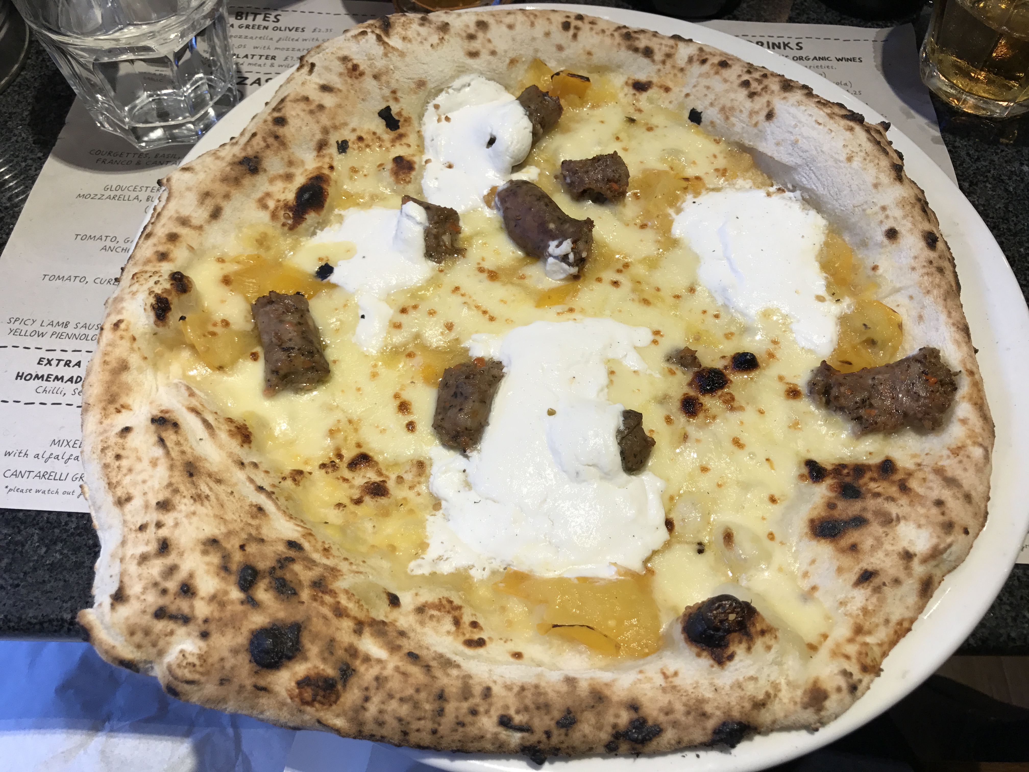My pizza, by contrast, just didn’t work. I went for one without a tomato sauce base and instead it came with yellow tomatoes, buffalo ricotta and spicy lamb sausage. It looked unbalanced to me when they put it down in front of me and it tasted unbalanced too: the tomatoes were sweet, the ricotta was sweet and although the sausage – something a bit like merguez – was genuinely fiery and delicious there just wasn’t enough of it to counteract everything else. Again, everything looked assembled at random and in this case it made for quite an unattractive pizza, with the sausage unpleasantly reminiscent of droppings and the ricotta looking disconcertingly like cuckoo spit (hungry yet?). The pesto dip was an excellent idea but in execution it just lacked enough salt and parmesan to offset the oil.