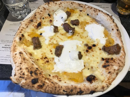 If I won the battle of the starters, I think Tim did better on pizza. His was a pretty classic combination – tomato sauce, mozzarella, and (according to the menu) both dry and semi-dry chorizo. And it looked good, although I did have some reservations; maybe I’m just greedy but it felt a little light on chorizo and what chorizo there was was so unevenly distributed that it looked like it had been dropped onto the pizza from a great height by someone with their eyes shut. Again, I wondered if I just wasn’t cut out for this new devil-may-care attitude and perhaps literally nobody else would be bothered by this. What can’t be denied, though, is that it was tasty: the crust was bubbled, blistered and light, the base top notch.