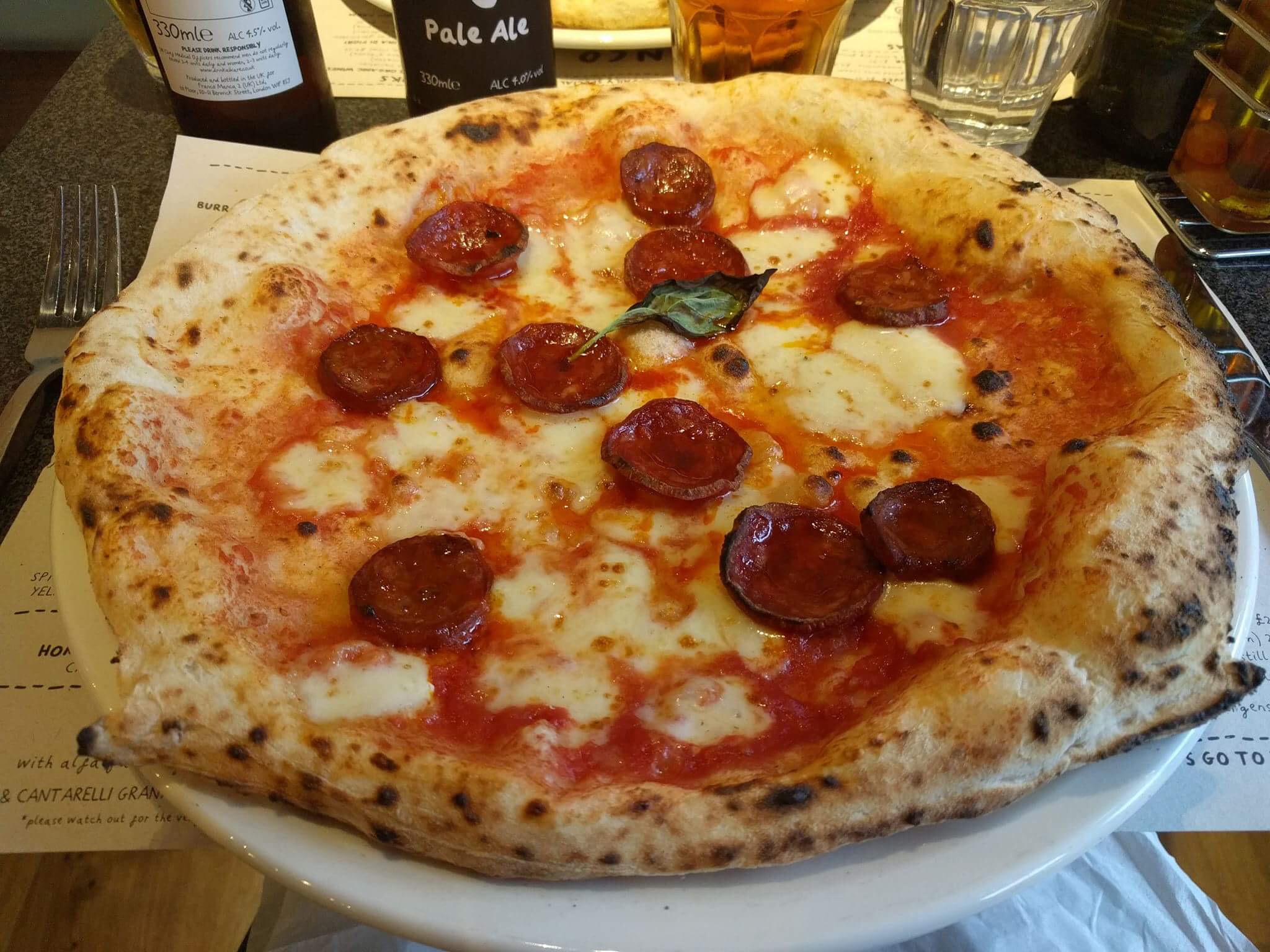 The pizzas took longer to arrive than I expected, which was no bad thing although it was characterised by a bit more ineffectual service. I’d ordered a dip for my crust (or “cornicione” as the Franco Manca menu likes to call it) and there was some general chaos about which one I’d gone for – pesto, since you asked – which even led to the manager having to come over and ask me what I’d ordered. She was quite brilliant, bright and personable – but if anything, that just highlighted that the rest of the service had been a bit… well… I’m struggling to find a more appropriate word than “gormless”, so let’s just leave that there.