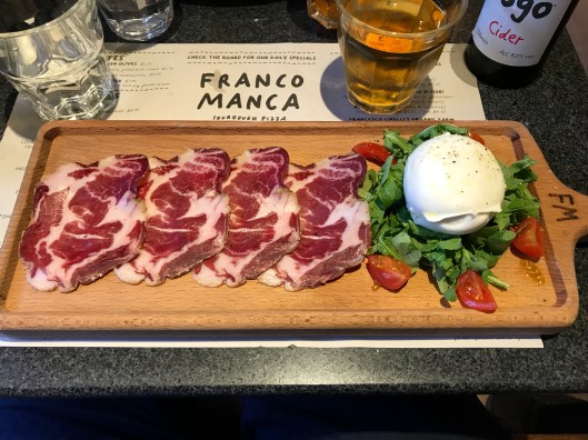 When I go for dinner on duty with a companion, I like to play little game at the end. We text our rating out of 10 to each other simultaneously, like some kind of digital gunfight, and compare notes. Tim’s rating was nothing special: he wasn’t impressed with Franco Manca. He said the food was good but not good enough to overcome the room and the service. He’d sooner go to Papa Gee, he said, and of course I felt a little bit proud of him for that. It quite outweighed his shortcomings when it came to describing chorizo, which after all is a niche skill in anybody’s book.