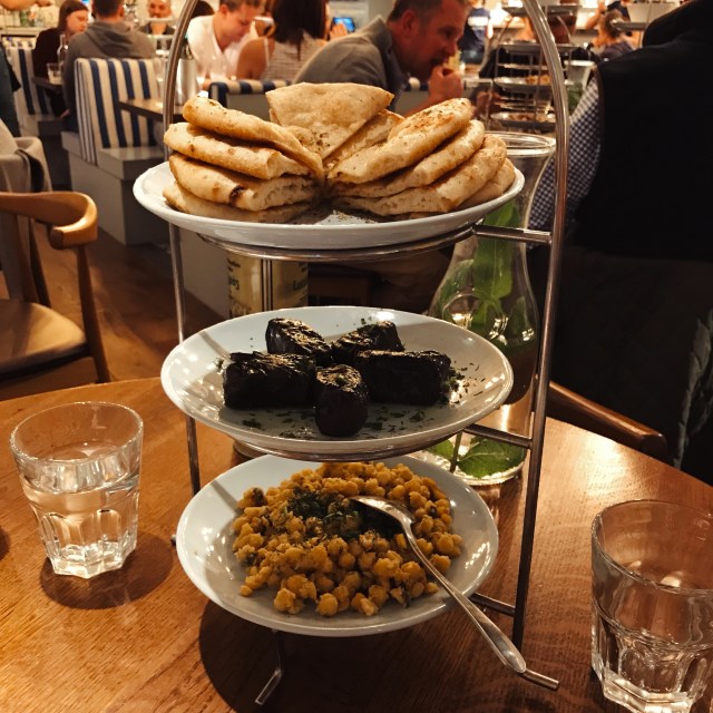 We chatted away about our recent holidays – Porto for Steve, Bologna for me – and the first set of dishes arrived. The other gimmick at The Real Greek is that your sharing plates arrive in a tall stack, like afternoon tea. That might be your bag, it might not: I found it irksome but it was easy to take them off the rack and spread them out on the table as nature intended. If I’d been at a smaller table for two, it might have properly got on my nerves.