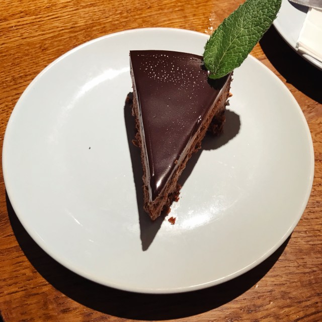 We pressed on with dessert, because we were having too nice an evening to want to bring it to an end. That’s as noble a reason to order dessert as any, but the decision provided probably the meal’s biggest misfire in the shape of my baklava – a big stodgy slab with no real crunch or subtlety, no layers, no sticky sweetness. What you got instead was some faintly damp pastry, and a big claggy layer of crushed nuts, and the whole thing was cold and unimpressive. You got better baklava, back in the day, eating Georgian food at the Turk’s Head and (trade secret alert) I have it on good authority that they bought theirs from Costco. Steve’s chocolate mousse cake was considerably nicer, if not remotely Greek. “Not bad” he said, between mouthfuls, “but they’ve definitely bought this in.”