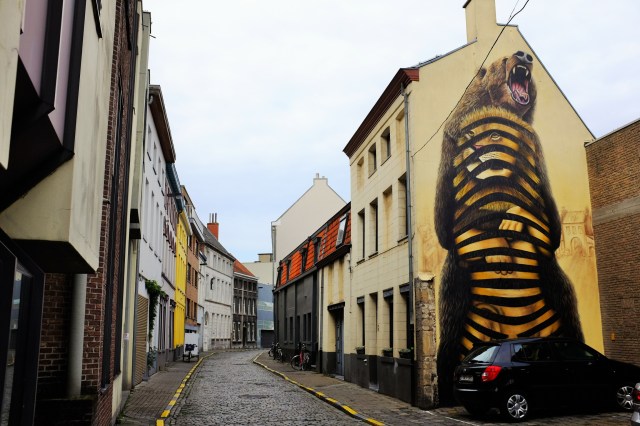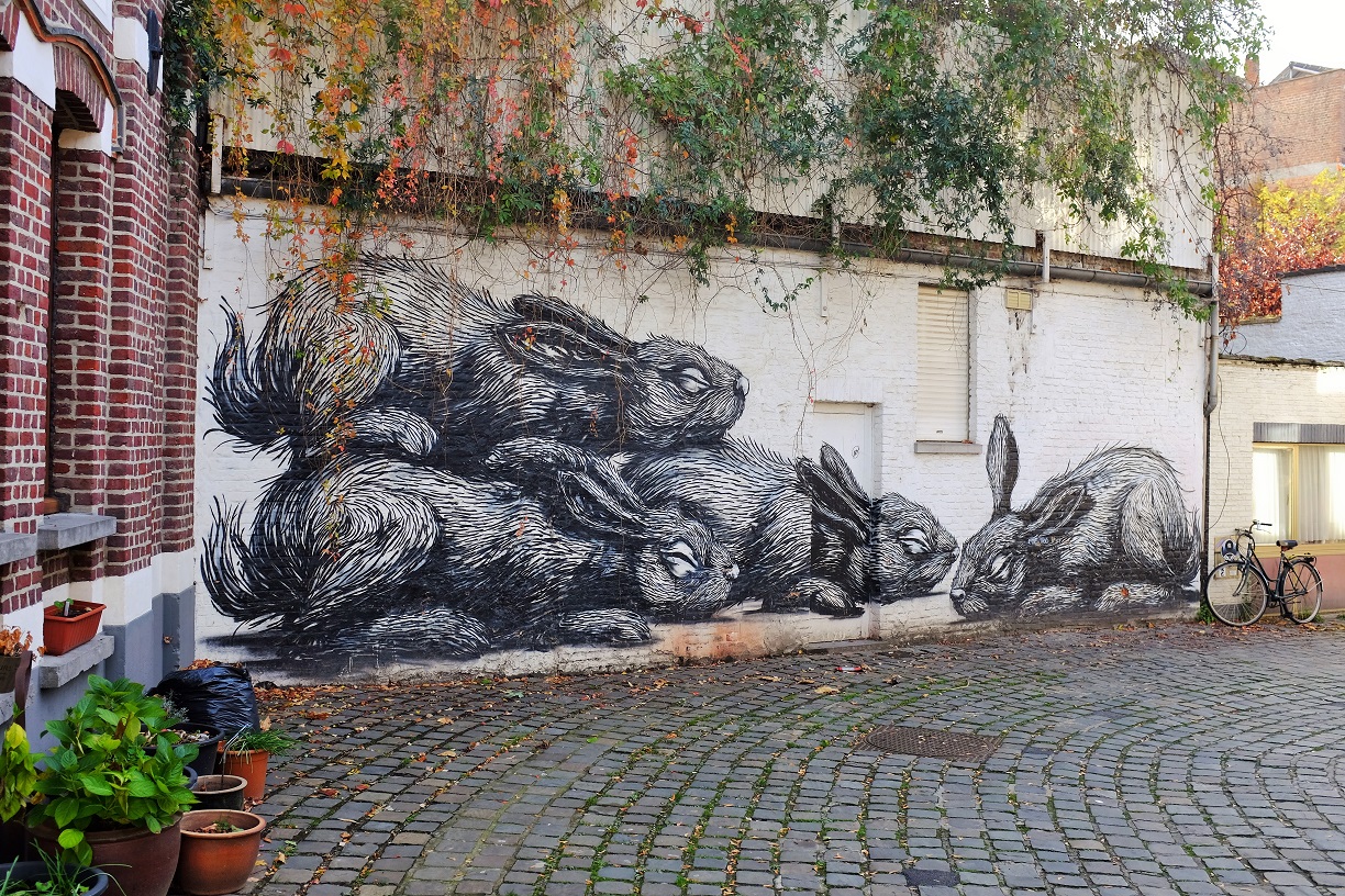 Further research revealed that Ghent is in fact famous for its street art, all over the city, and indeed some of its artists. So we downloaded the street art map from the Visit Ghent website and went on a truly enjoyable odyssey round the city, hopping from location to location. Some were small, subtle pieces, and some were jaw-dropping: the whole side of a building transformed into a massive, vivid canvas. The trip took us out into the docklands, another part of Ghent I’d like to see more of, and incredible industrial buildings, glass bricks and converted warehouses, hip-looking cafes on street corners. Every single dot on that map offered something new, many offered something stunning, and I could quite happy have whiled away another afternoon seeking out the whole lot. The picture below of rabbits by Ghent native ROA was probably my favourite find, and if I thought it looked familiar it was probably because I’ve also seen his work in London.