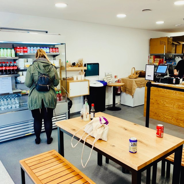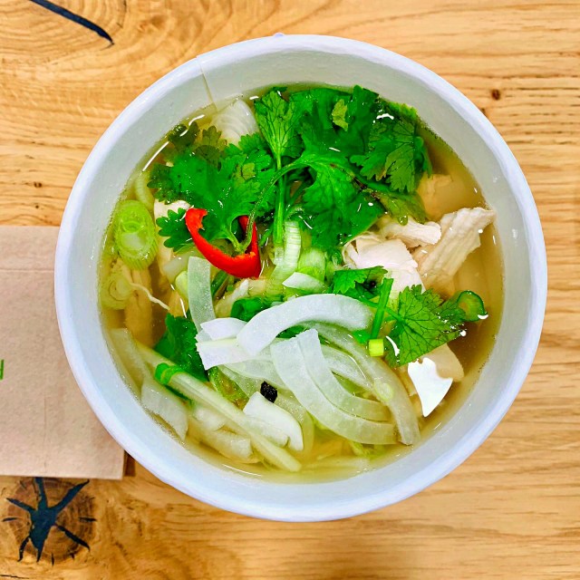 The bánh mì was more like it, although still not quite there. There was chicken, plenty of it in fact, and although it wasn’t fresh off the grill and straight into the baguette it was still piping hot and reasonably tasty. There was plenty of what I think was shredded pickled carrot and daikon, which lent cleanness, bite and crunch. The excessively thick discs of cucumber all down one side I could have done without, but that might be more to do with me and my feelings about cucumber. And there was a little coriander and mint, although really just enough to make me wish there was more. It needed more full stop, and I could see plenty of ways that could have been done, whether by adding more zing and lime, a lot more coriander and mint, some peanuts or – the traditional element of a bánh mì, this – some pâté. It was a few steps above an entry-level hot chicken sandwich, but that was all. I wasn’t sure whether this was marketed at normal lunchtime shoppers or fans of Vietnamese food, but whoever it was aimed it wasn’t quite on the money.