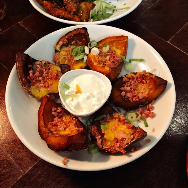 The other starter, loaded potato skins, had to be done; I suspect that it’s been on the TGI menu since time immemorial, a 90s time capsule in gastronomic form. The menu said they were “potato skins filled with melted cheese”, and the last time I saw a fib of that magnitude it was on the side of a bus: the skin wasn’t crunchy and moreish and barely featured in the dish. Nor did the melted cheese. Some of the skins had very little: “filled” wasn’t the right description, and “meanly sprinkled” would have been closer to the mark. The predominant feature of the dish was in fact the flesh of the potato, which means they were less potato skins and more just chunks of potato. We’d chosen to have them with bacon, but it was more like highlighter-pink indeterminate mince than lovely, crispy, salty bacon. The whole affair contained more flesh and gammon than the average Question Time audience, and was about as appetising. The sour cream gloop in the middle did nothing to improve matters, and nor did the token spring onions.