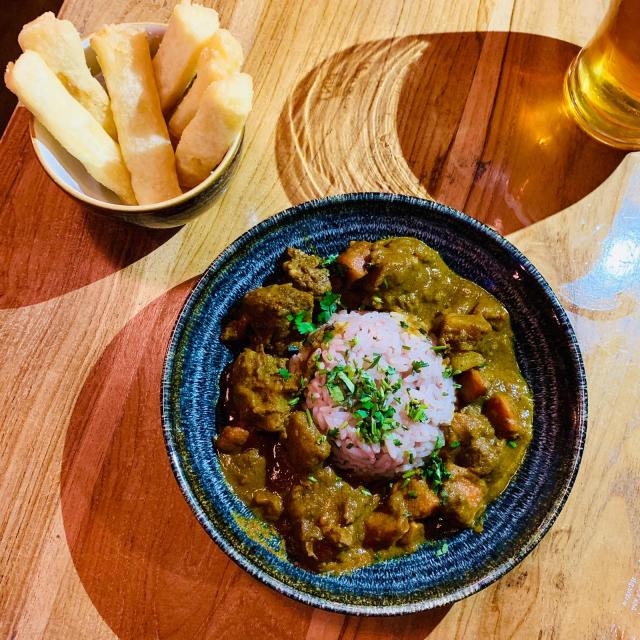 “It’s a mistake with the menu” I was told tersely. “It’s wrong. You don’t get naan bread, because it’s a Caribbean curry. These are yuca fries.”