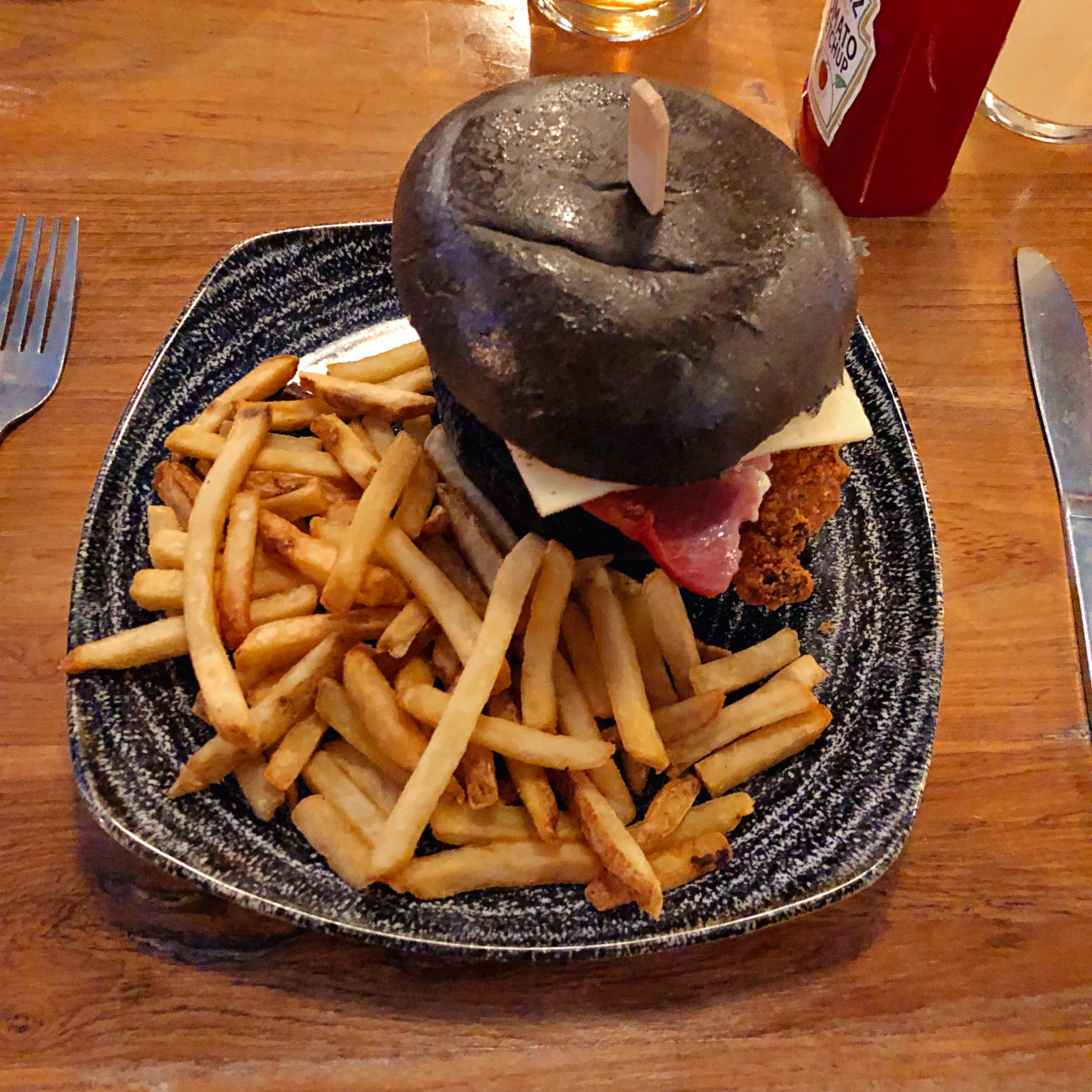 The charcoal brioche was weirdly, cloyingly sweet. The bacon – back, cooked to miserable limpness – was indifferent and salty. The burger itself was breaded and I’m not sure whether it was baked or fried but the coating had the texture of an asteroid with no discernible seasoning: the chicken, once you got to it, at least recognisably had started life as a fillet but after that it had been not so much cooked as mistreated. The thin slice of American cheese on top had been completely unmelted by the lukewarm contents of the brioche. I wasn’t sure how the kitchen had managed to overcook something, yet it still wasn’t hot: I wasn’t sure I wanted to know.