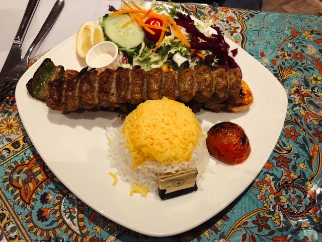 Martin had opted for the mixed grill for one, pretty much, the kebab bakhteari (“it sounds like bacteria” he said to the waiter, a tad ominously). It was a skewer of kofta, a skewer of chicken shish and a skewer of lamb shish, served with some rice with a little yellow hat from the saffron, an underwhelming-looking salad and – completely randomly – an individual portion of butter from a catering pack (what for? we both wondered).