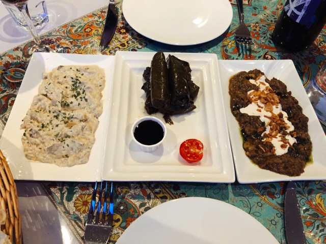 By the time we returned to our table from that little culinary detour, our starters had arrived. The menu divides the starters into cold and warm appetisers and we’d picked from both sections, although I didn’t discern any noticeable difference in temperature. The best of them was the baba ghanoush, which really did have a smoky taste (you could picture the charred skin being taken off the aubergine before the flesh was combined with everything else). But the dolmades were deeply unspecial – the rice in them was claggy and dense, and they didn’t taste of much. The decision to serve them with a little pot of what looked like balsamic glaze but which I assume was pomegranate molasses might have been to conceal the lack of flavour, but it seemed an odd choice. I would have thought these were shop bought but one of them was so saggy and lacking in filling that I think they probably were made by hand.
