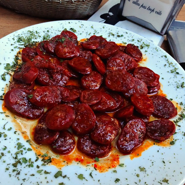 Caracoles means snails, and they are on the menu (many tables seemed to be having them as tapas) but if, like me, you’re not a fan there’s plenty to enjoy. I had some gorgeous hand-carved jamon and a big bowl of broad beans with (more) jamon, served with an egg on top, waiting to release its yolk into the rest of the dish. This was also my favourite people-watching spot: I became fascinated by a pair of dapper old gentlemen – Panama hats and all – at the next table eating, drinking and waving their hands around. I couldn’t decide whether I wished I could eavesdrop on them or whether knowing what they were saying would have killed the magic.