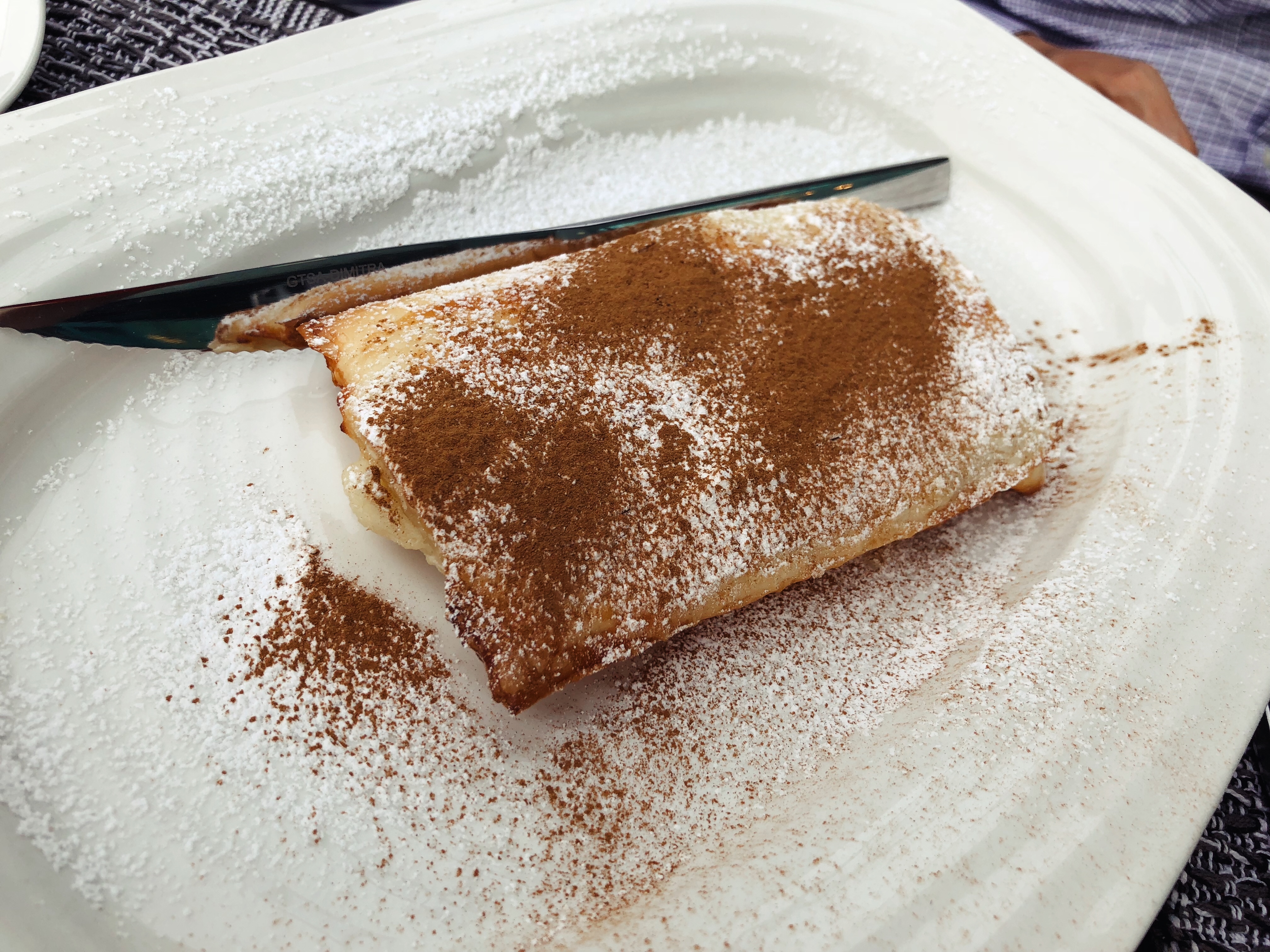 My stepfather’s bougatsa, custard in filo pastry, was better but still not right. I liked the custard very much, but this pastry didn’t have the same lightness of touch as our starters had had. Sawing through it with a knife felt like a slog. “It’s a bit tough” said – well, I’m sure you can guess who said that.
