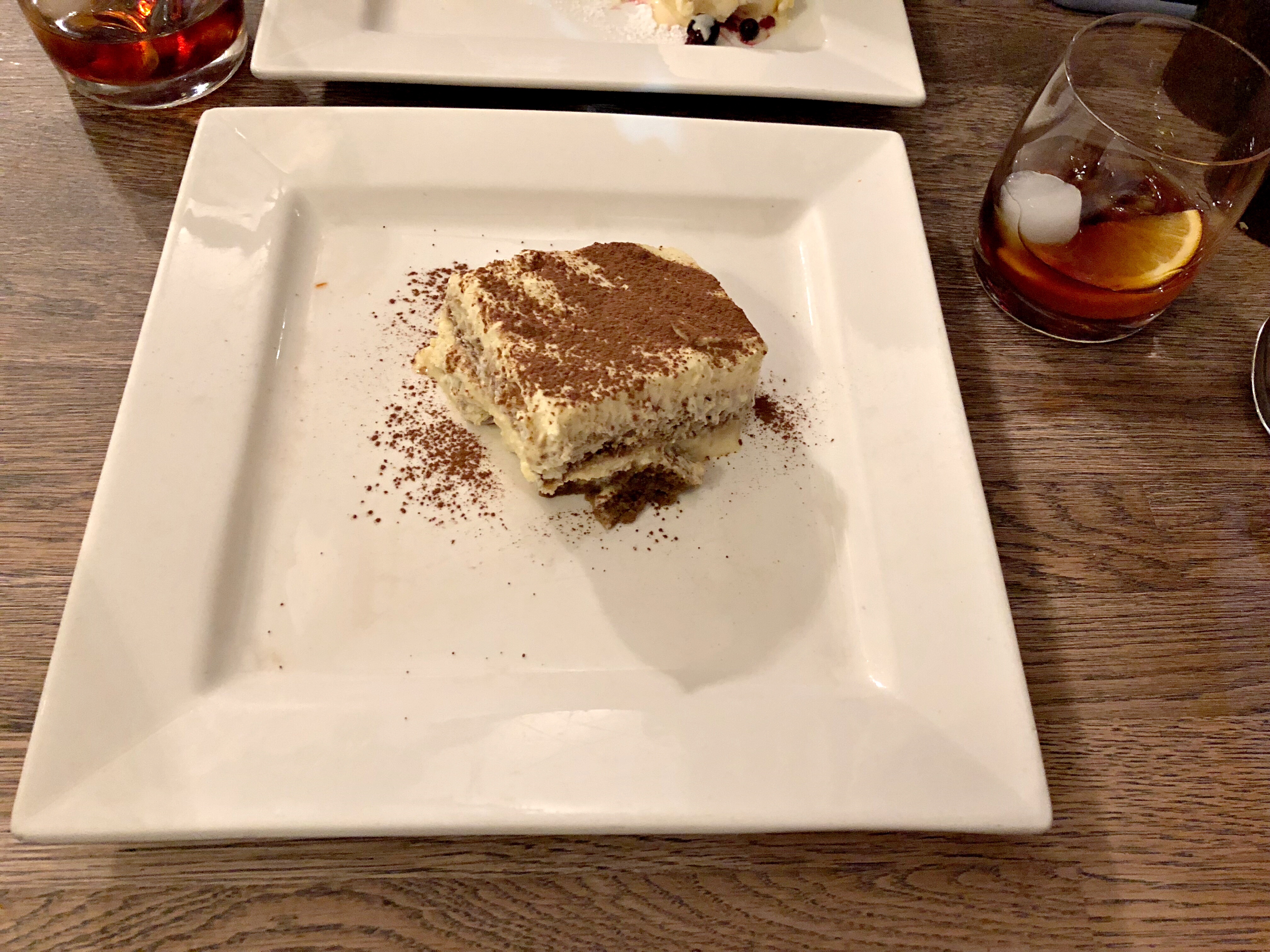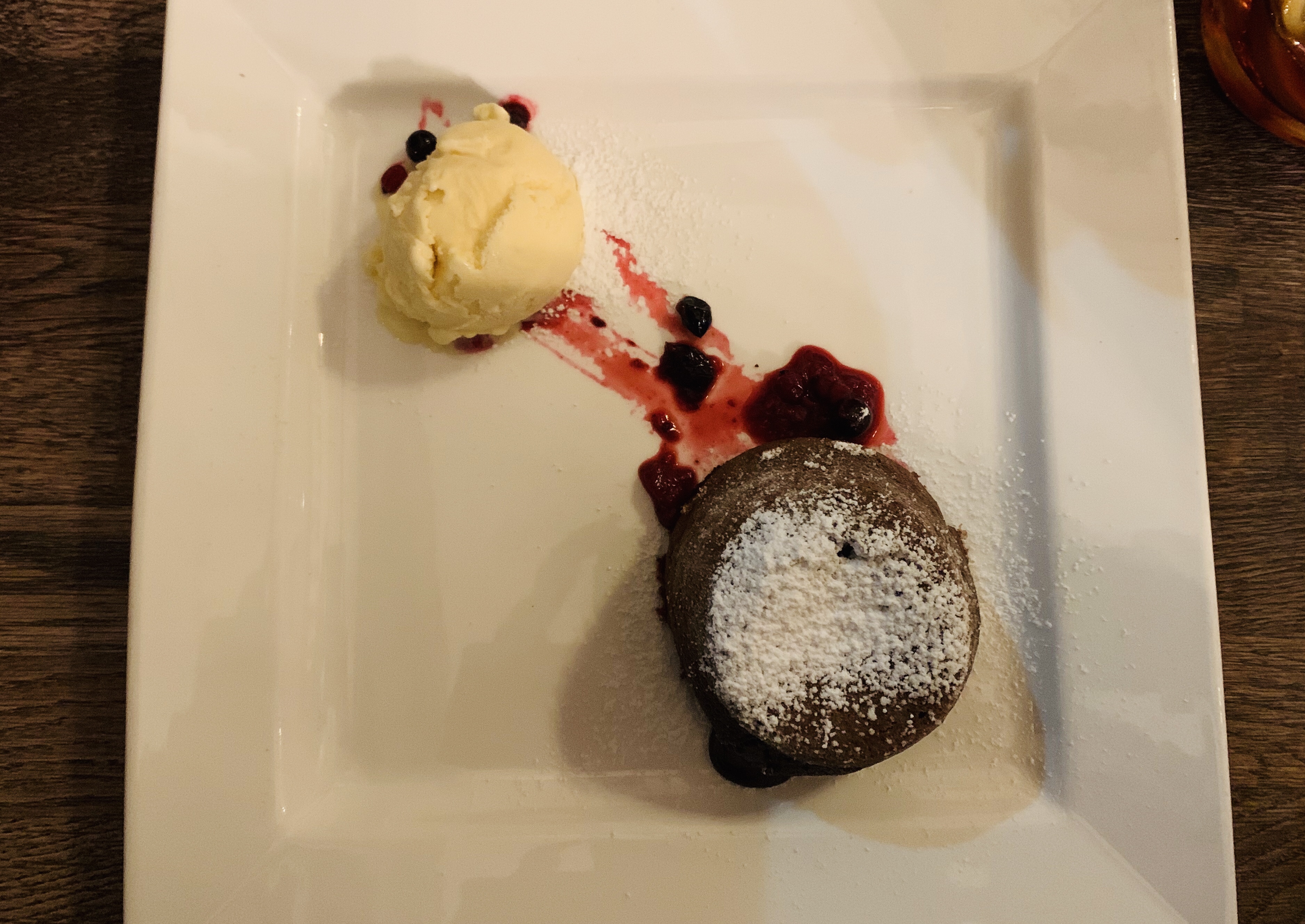 I always judge Italian restaurants on whether they have something decent to drink after dinner, so we were taking our first sips of Averna (bittersweet, on ice with a single wedge of orange) when our desserts arrived. Chocolate fondant, like all hot desserts, isn’t really to my taste but I tasted enough of Zoë’s to verify that it was faultless. The contrast in textures was absolutely as it should be, no over-gooey mess in the middle but not dried out either. It’s not a dish I ever order, but I’m glad Zoë picked it; there are few things quite as enjoyable as watching the person you love eat something they adore.