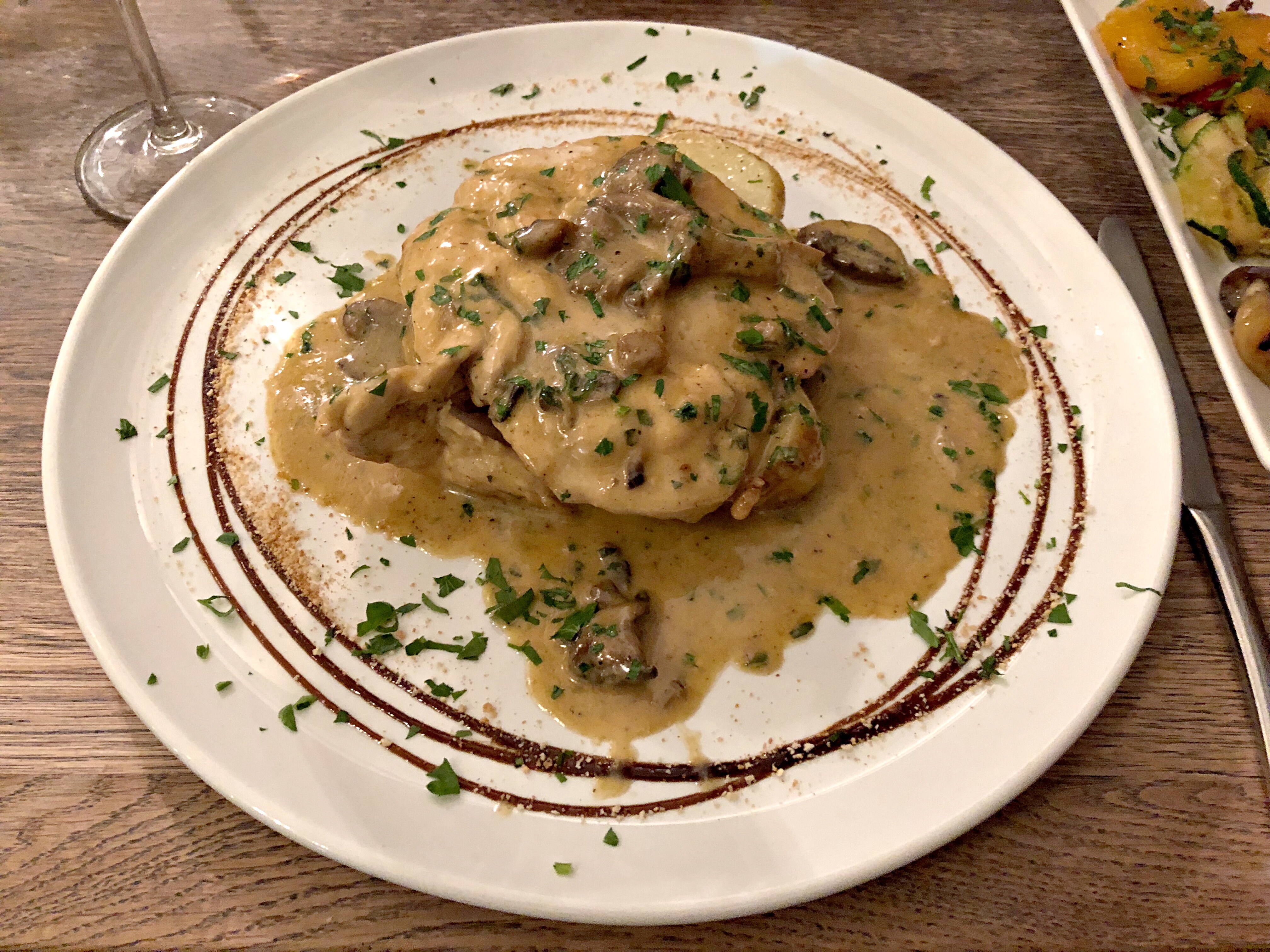 If the meal had finished there, it would have been pretty damned good, but the main courses kept up the standard without a misstep. My chicken with Gorgonzola and wild mushrooms was from the specials menu and was another beautiful dish. Like the pasta dishes, it’s the kind of thing that features on the menus of Italian and faux-Italian restaurants across the country, but you can tell when it’s executed with skill. The sauce was silky, with enough tang from the blue cheese but not so much that it overpowered everything else going on. Crucially, the “wild mushrooms” were in fact wild: they are so often tamed somewhere between the menu and the kitchen. The rosemary roasted potatoes didn’t get a chance to shine, sitting under the chicken and smothered in the sauce, but that was hardly a bad thing.