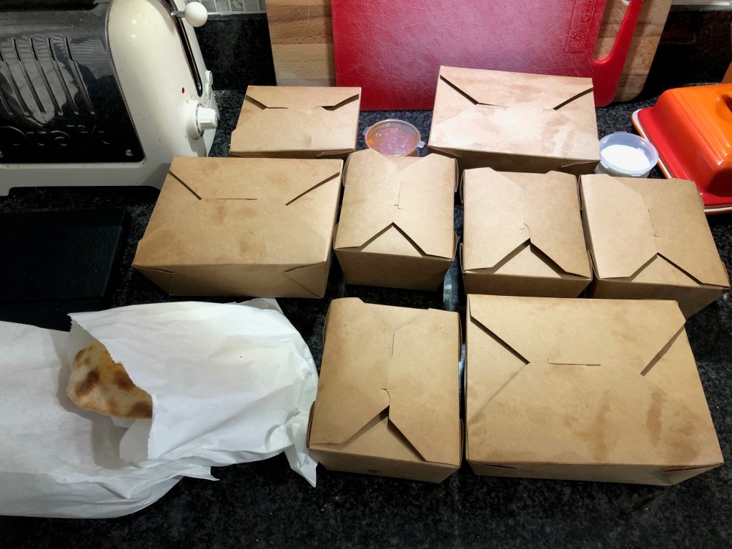 Everything was in recyclable cardboard boxes, and the attention to detail was spot on – everything that was meant to be hot was, and everything that was meant to arrive chilled had survived  the journey without warming up. We decanted some of it onto dinner plates and took the rest through to the living room to be divvied up when we’d cleared enough space.