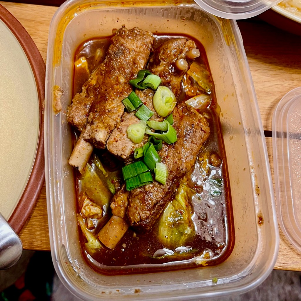 The problem with takeaways, as I’ve said before, is that it isn’t that practical to eat two separate courses – you’re bound to have one of them past its best, or kept warm when it should have been eaten there and then – so often starters find themselves promoted to side dishes, as happened here. The first of the starters was ribs, which came in a deep, dark sauce without much chilli heat but with a hint of peanut and what felt like braised lettuce swimming around at the bottom. The meat fell cleanly off the bone with three of the ribs, while the fourth was a distinctly more cartilaginous affair.