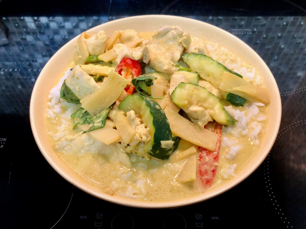 Zoë had stayed traditional with a green chicken curry, and I was allowed a forkful (“but that’s all, I’m not sharing”). It had considerably more punch from the chilli and crunch from the bamboo shoots, and the chicken was tender, but I didn’t feel like I was missing out by sticking with my choice. It was a decent effort, and probably healthier by virtue of containing more veg (the courgettes had the same crenellations as the potato in my curry), but I would have liked it to have a little more richness and oomph. I was graciously permitted to approach the bowl again with my fork to try some of the rice and sauce – for me, always the best bit of eating Thai food – and that was enjoyable enough to make me think I might have judged it harshly.