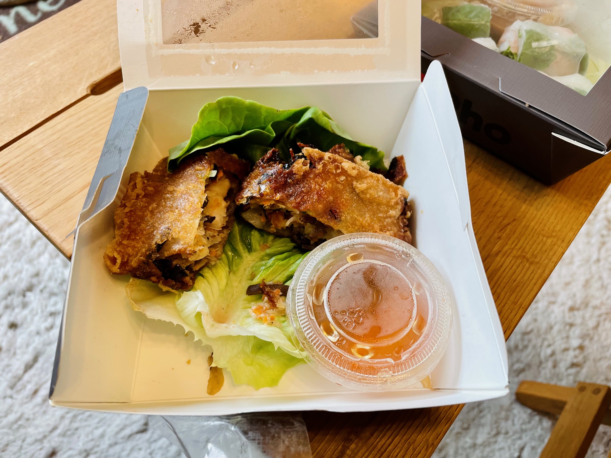 We ordered the things we always order, because this was an evening all about comfort and familiarity, and three starters and two mains came to forty-five pounds, not including rider tip. And, as so often with orders from the town centre, there were no real hiccups: we ordered at half-six, the rider was en route fifteen minutes later and he got to us in just under ten minutes, making another stop en route to my house. Everything was hot and everything was well packaged, in well-branded boxes, all of which were recyclable. Again, what this brought home is that delivery has never been a pandemic-mandated side hustle for Pho: it’s always been part of their business model, and I think that shows.