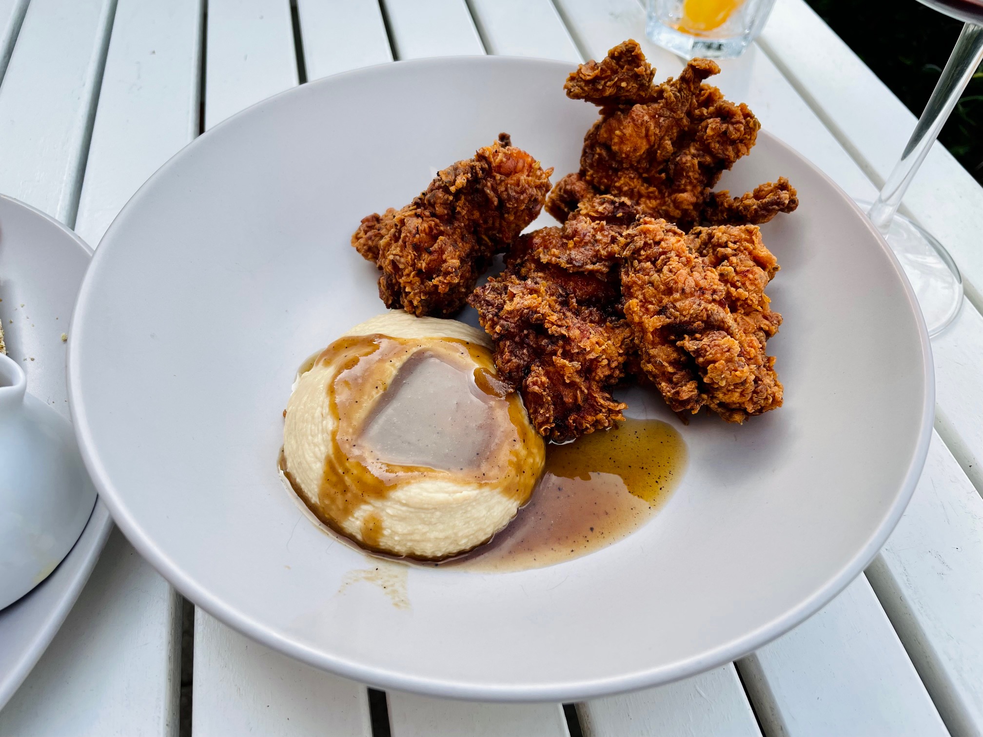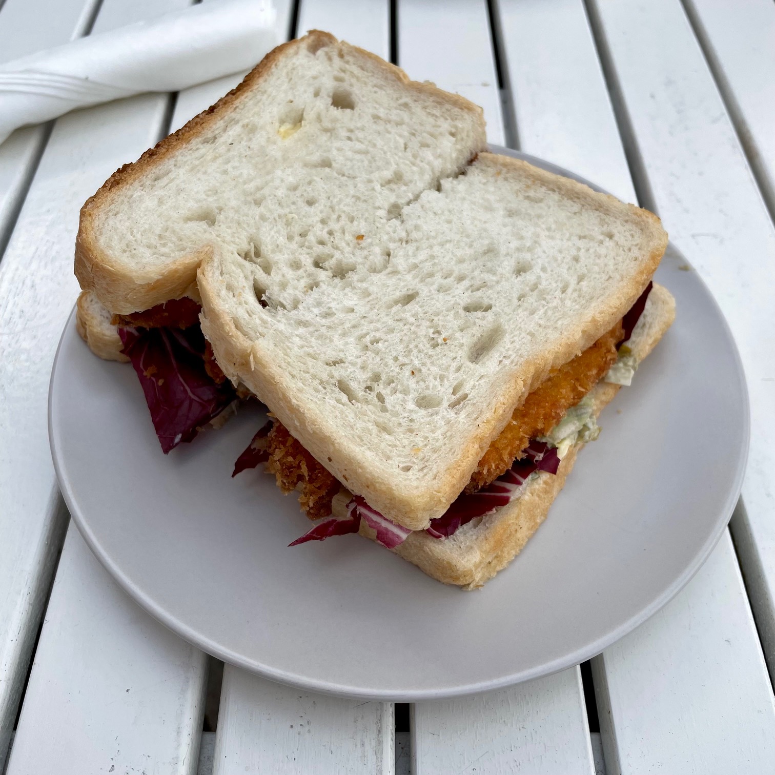 Our food came out relatively quickly, and this was the point where we had to start eating both our meals and our words. Because really, there was lots to like. I’d chosen the fried chicken burger and was pleasantly surprised. It had good spice and crunch, a slightly soggy hash brown underneath, a good whack of cheese and a piquant bright orange sauce, much of which had seeped out onto the tray. The hash brown felt like padding, and the whole thing was almost well-behaved and prim – you didn’t quite have to unhook your jaw to eat it – but what was this strange feeling? Could it be that I was… enjoying it?