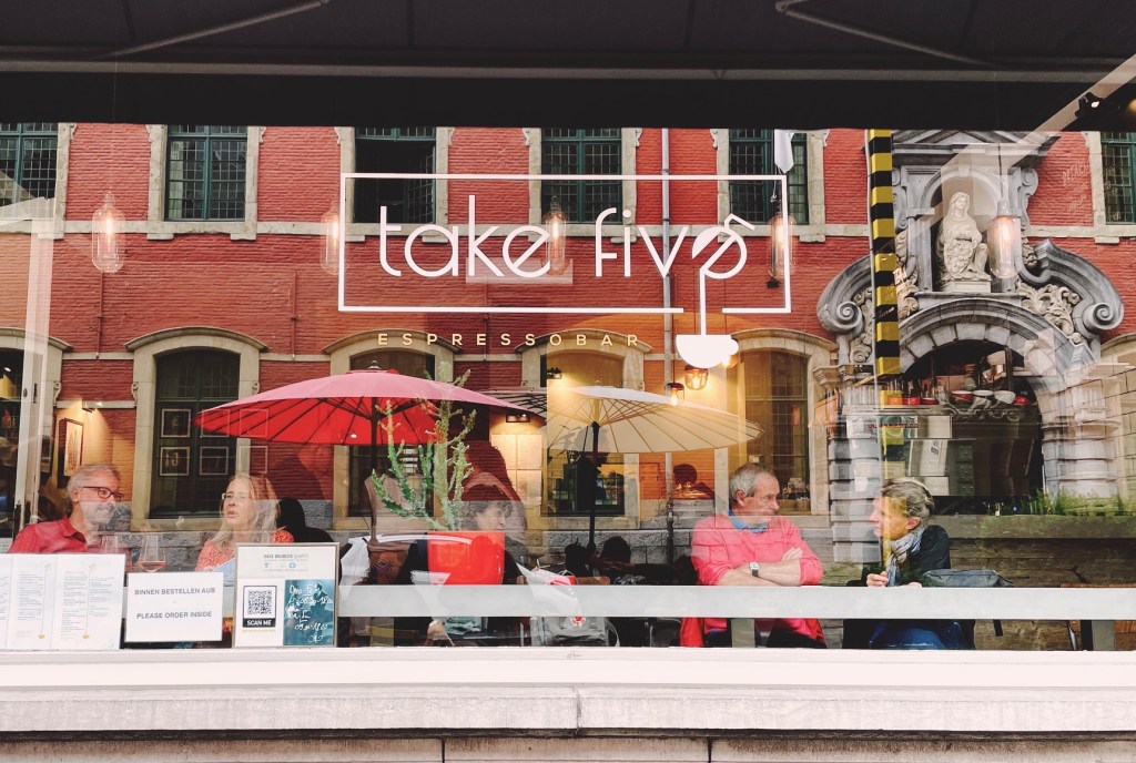 My absolute favourite coffee place of the holiday was Take Five Espresso in the centre of Ghent. I never completely decided whether I preferred being inside, sat up at the big windows watching city life bustling by or outside in the sun (their seating is dead clever, making full use of the public benches on the street). What I did work out though was that their lattes were magnificent and that by the end of my trip it was hard to imagine being caffeinated anywhere else. It was the epitome of café chic and I enjoyed it a great deal. I never tried any of their food, but you can blame Kultur, the excellent bakery next door (and their pain au chocolat) for that.