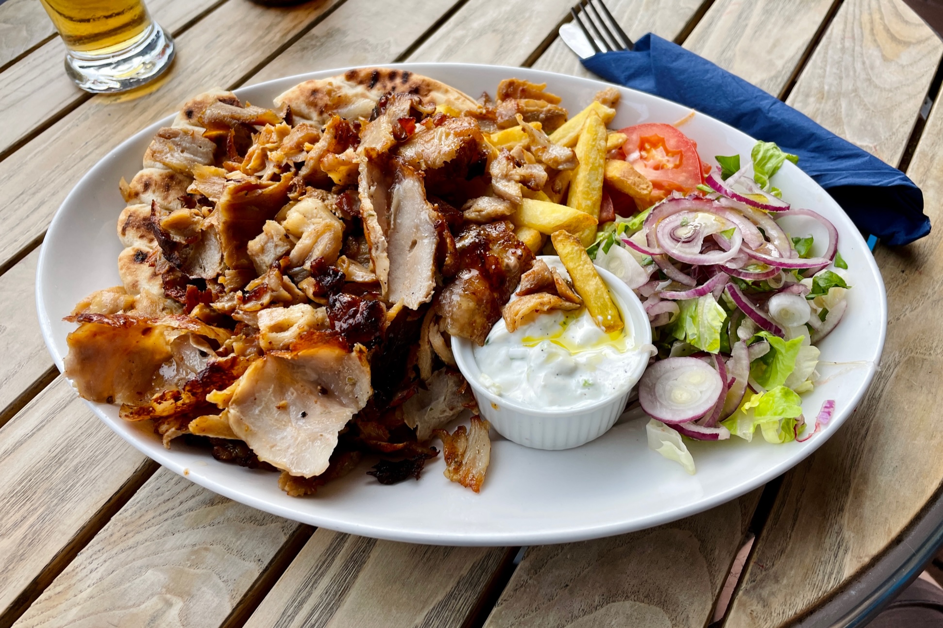 If you’re there in a pair or a four it’s really hard to beat the mixed grill, which is a cornucopia of meat – souvlaki, gyros, keftedes, pork belly and sausage – with something for everybody. But if you’re eating solo, the merida platter of crispy, salty gyros meat with chips, fluffy pitta and tzatziki is one of the best and best value meals for one you can find in Reading. And it’s a great place to dine solo: at some point I’ll put together an updated version of my feature on the best tables for one in Reading. When I do, expect Tasty Greek Souvlaki to be on it.