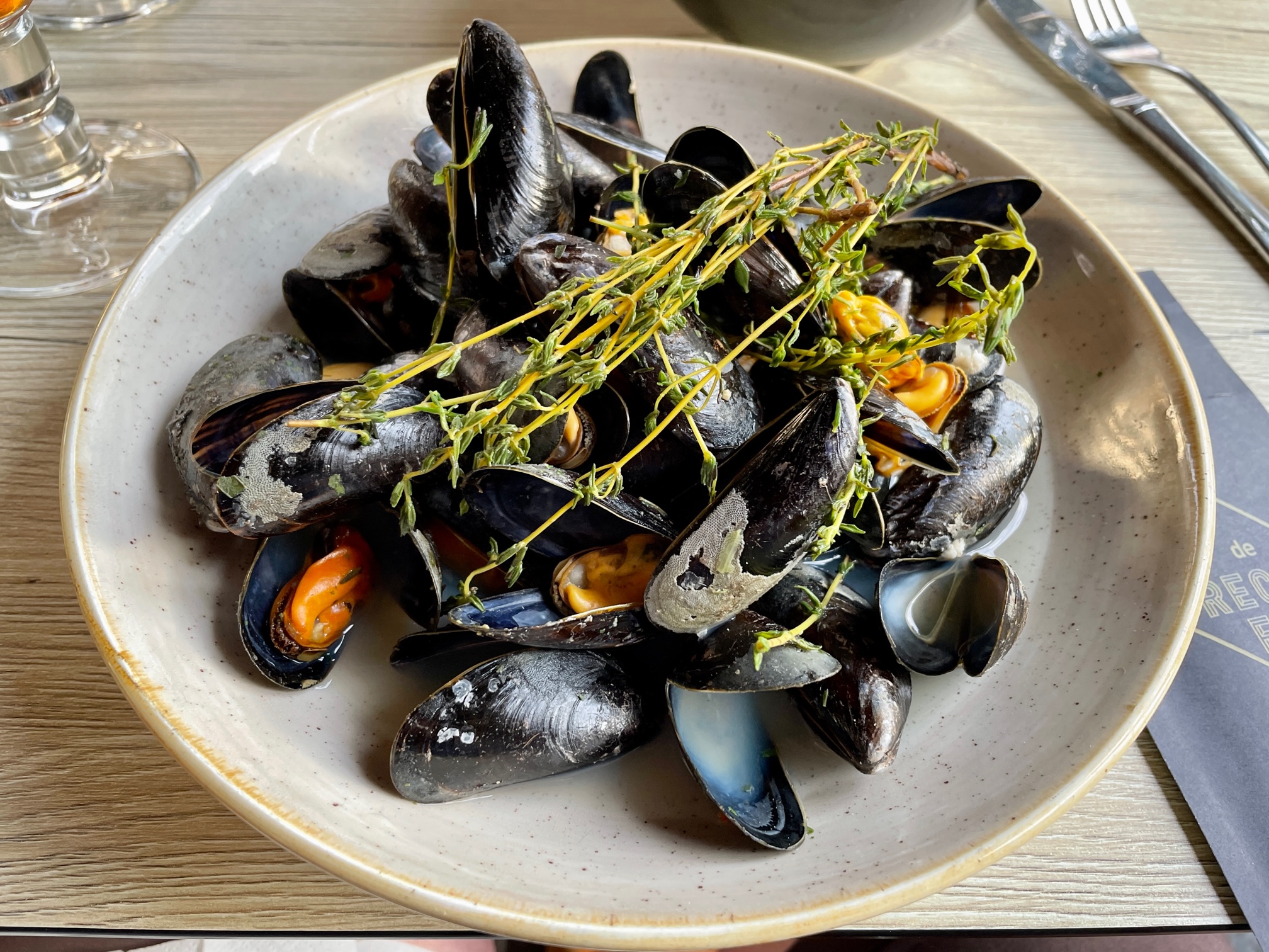 Never having had moules in Belgium – I know, such an oversight – I had some as a starter, cooked simply with thyme and they were plump and fragrant. But next time I’ll go the whole hog and have them as a main with garlic and cream, which for me is the only way really to eat moules, dipping your bread and frites into the sauce until you are truly replete.