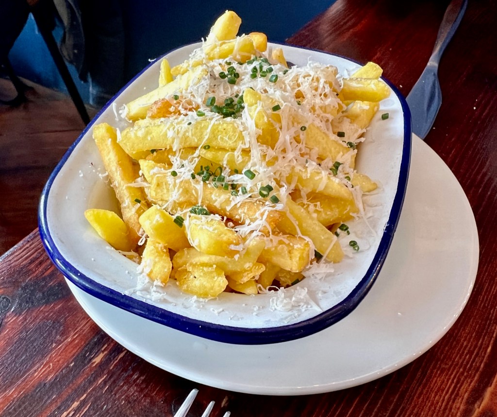 Oh, and we also had some chips with aioli: they didn’t go with anything but it’s hard to pass up chips with aioli. The chips were great – I think the food blogger chip cliché is to wank on about “rustle and snap”, whatever the fuck that is – and although the aioli was good it came in another of those mingy paper cups and I had to ask for more. Not that it was any trouble: service was terrific from start to finish, just as it always is at the Magdalen Arms.