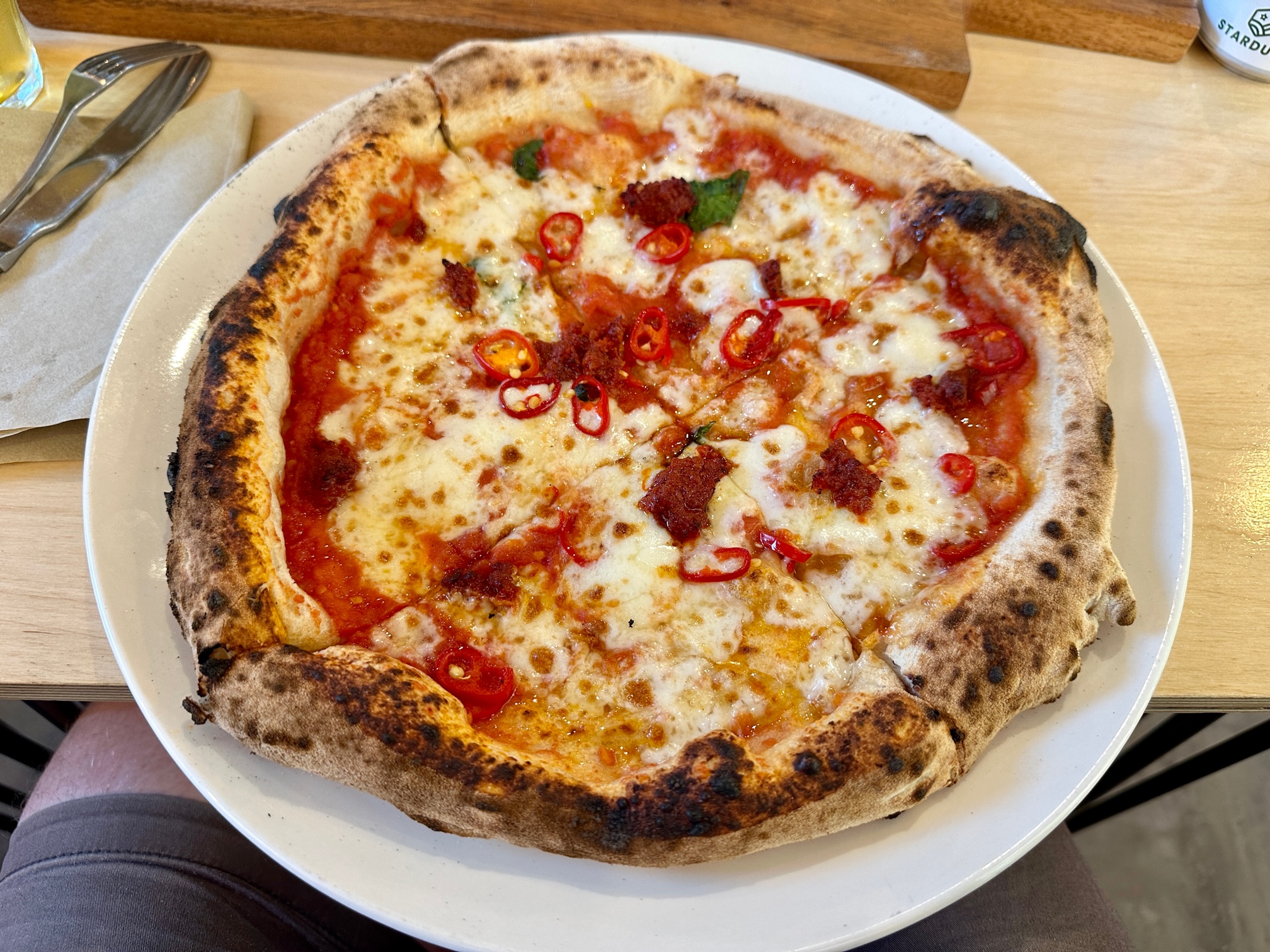 Mine, the “Sergeant Scoville” was that modish classic, the pizza with ‘nduja and some other stuff. In this case they hadn’t thrown the kitchen sink at it, so just ‘nduja, chillies and some hot honey from a London company called Dr Sting. Maybe my tolerance to heat has ramped up after years of Clay’s and Kungfu Kitchen, but I thought this was affably mild. The ‘nduja though, from Cobble Lane, was absolutely spot on with that almost-acrid, savoury punch, and they weren’t stingy with it. The hot honey got lost in the mix a little, but I’d love to see Knead pair it with some blue cheese.
