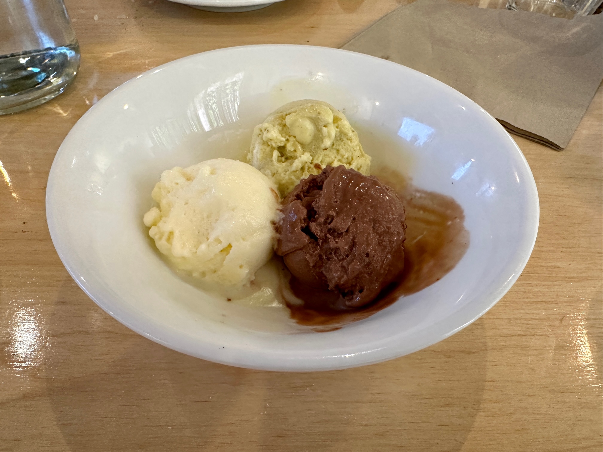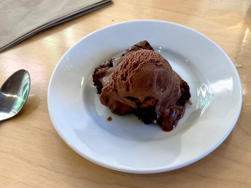 Zoë had a scoop of that bitter chocolate ice cream – a generous one at that – on top of a fudgy, gluten free double chocolate brownie. Just as I have friends who think a white pizza isn’t a pizza, I have other friends who think a brownie isn’t really a dessert. I have more sympathy with the latter school of thought, but anyway Zoë loved it.