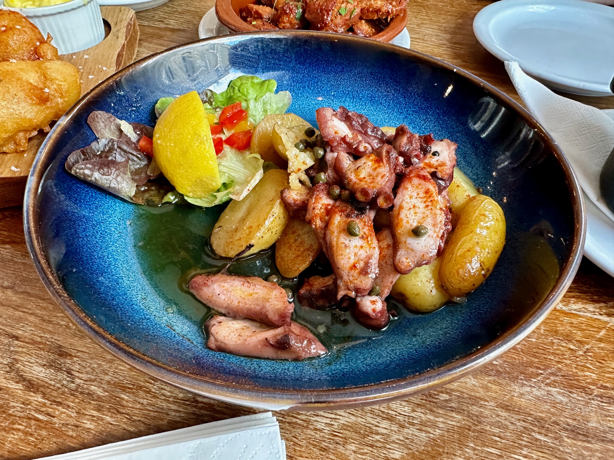 We went to Rincón de Rodri on our last night in the city in 2023, a Friday night, and I had the best time there. It’s a seafood bar and restaurant – tall tables and the bar at the front, and more conventional tables at the back. We’d reserved a table for four, so we were at the back, and it was all a little faux nautical with blue and white striped walls. Only one other table was occupied, and I wondered if we’d made a bad choice.