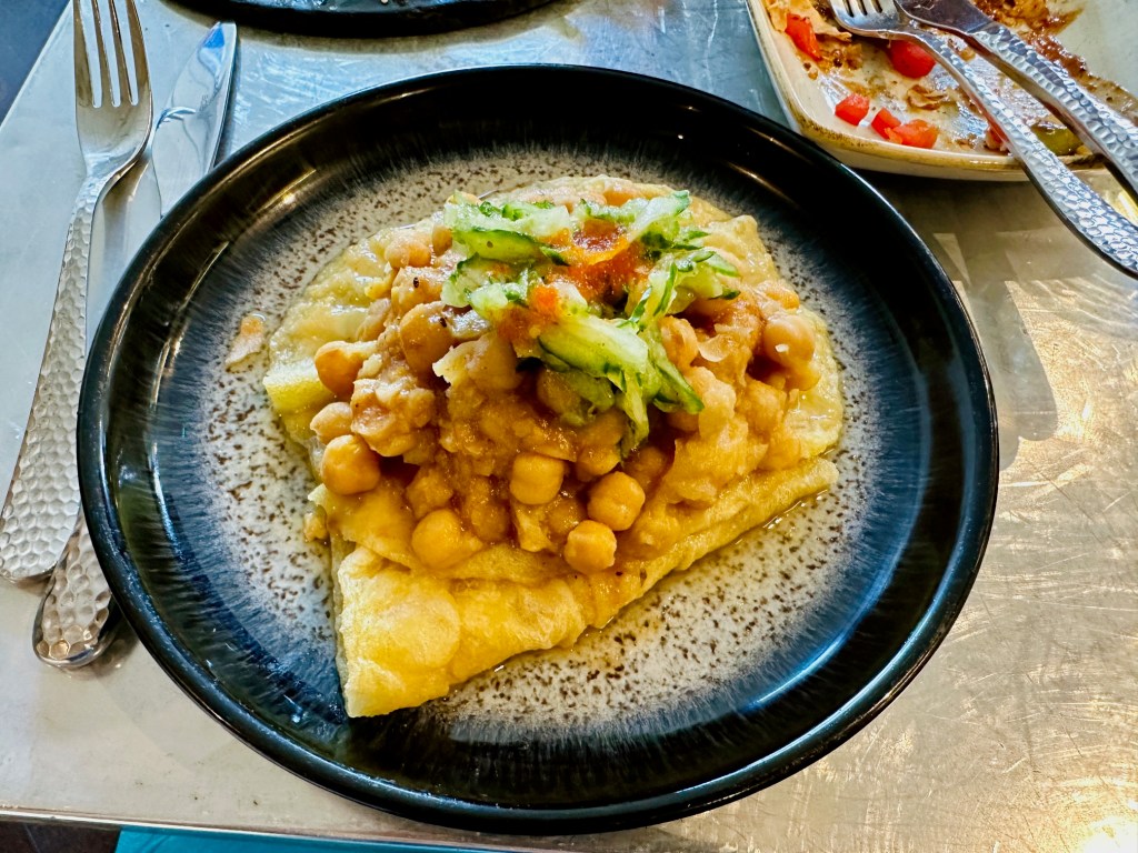 Even better, and genuinely delicious, was something called “trini doubles”. This is a Trinidadian speciality, curried chickpeas on a pair of baras, flat fried dough not entirely unlike a roti, and a quick scuttle to confer with Professor Wikipedia suggests that this dish, created in the Thirties, might be a Caribbean take on the Indian chole bhatura. Be that as it may, this was a gorgeous dish – floury, warm and comforting, and a forkful of the chickpeas folded into the starchy, slightly stodgy embrace of the bara was reason enough to be in Spiced Roots. That a little sweet, zingy, almost caramelised courgette, in the finest strips, was heaped on top just made me love the dish more. Again, this cost less than a fiver.