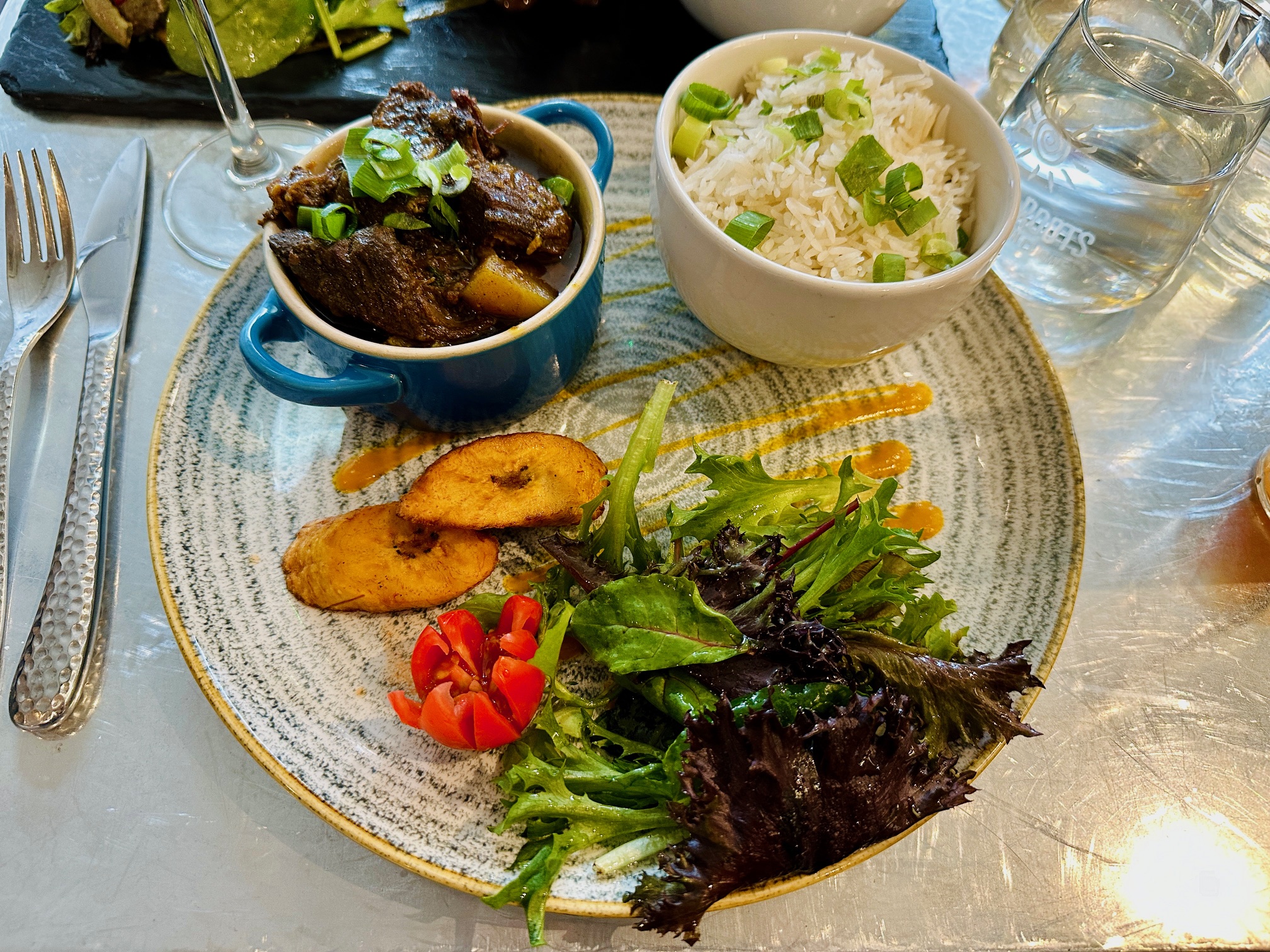 And yet the presentation was needlessly prissy. The curry was in a little vessel, the steamed rice in a separate bowl, there were a few random slices of plantain on the side and a salad which genuinely didn’t go and I’m not sure anyone eats. Were you meant to spoon the curry onto the rice, or gradually cross the streams while keeping the salad safe from harm? I ended up dumping the rice on the plate, pouring the curry on top and thinking that, rather than all the compartmentalisation, all I really wanted was a big steaming bowl of rice with plenty of curry on top – something earthy, hearty and unpretentious. I know Spiced Roots billed itself as fine Caribbean cuisine, but I don’t think that means you have to put obstacles between the food and the diners enjoying it.