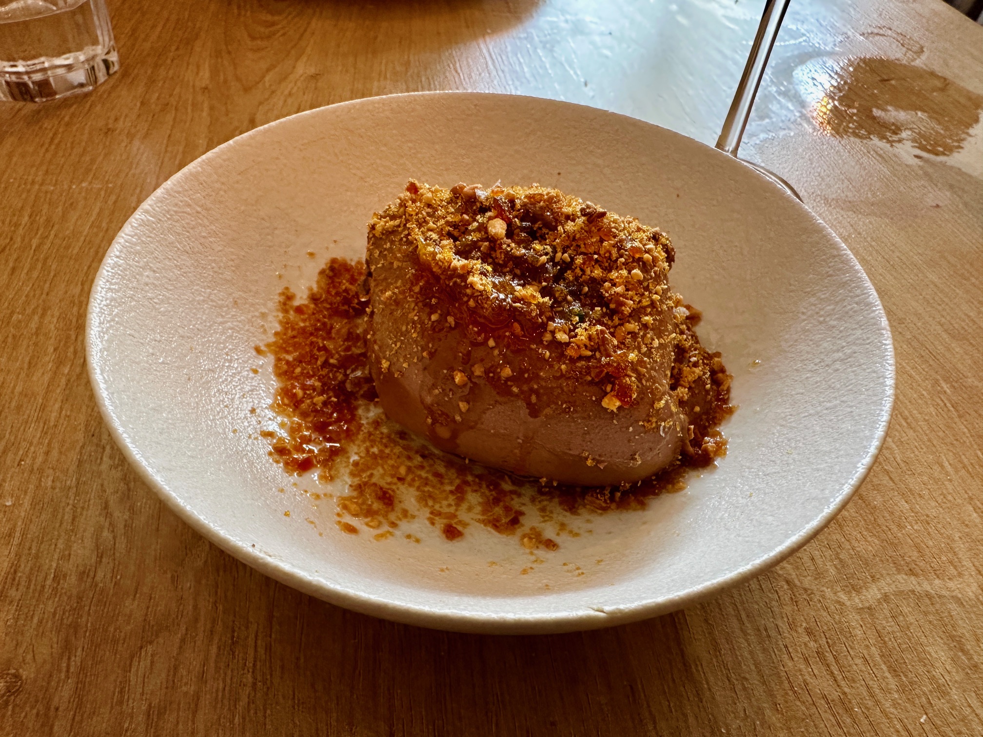My dessert wasn’t what I was expecting either. I knew a vegan chocolate mousse would be different, and I was expecting it to be darker, but what I wasn’t expecting was that it was completely lacking in aeration, the texture, bubble free, more like a cremeux than a mousse. I didn’t mind it, but the cognitive dissonance cancelled out some of the delight. The almond praline was more like a crunchy crumb and the marmalade on top had a lot of heavy lifting to do to offset that slick sweetness. Like a lot of what we’d eaten, it wasn’t quite there.