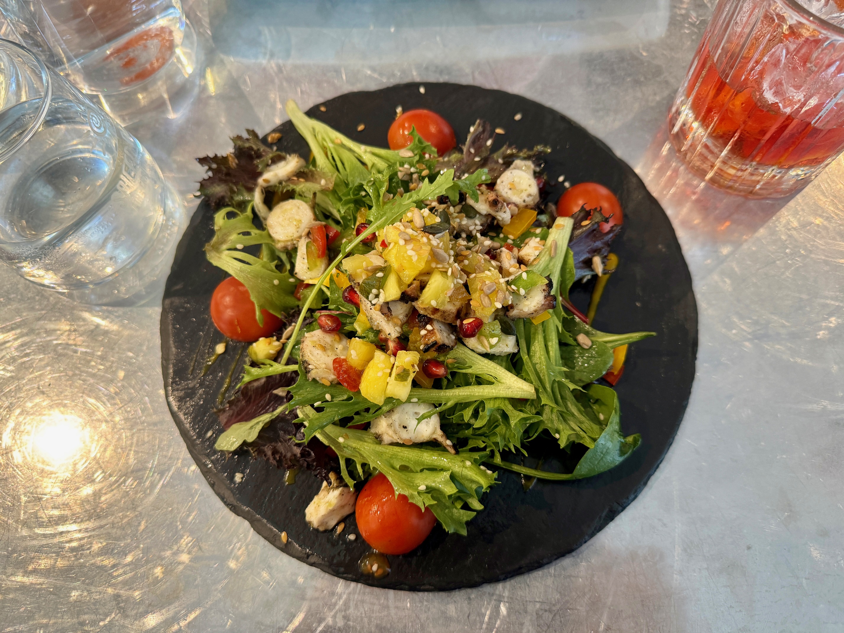Last but not least, we’d also decided to try the grilled octopus superfood salad. It was perfectly pleasant – what octopus there was was nicely cooked, the salad was well dressed and the pineapple on top added good contrast. The menu described it as pineapple chow, which is apparently spiced and enhanced with garlic and hot sauce, but I just got sweetness, really. This dish was nice enough: subdued, well behaved but not earth shattering. But that’s my fault, I suspect, for ordering something described as a “superfood salad”, not theirs.