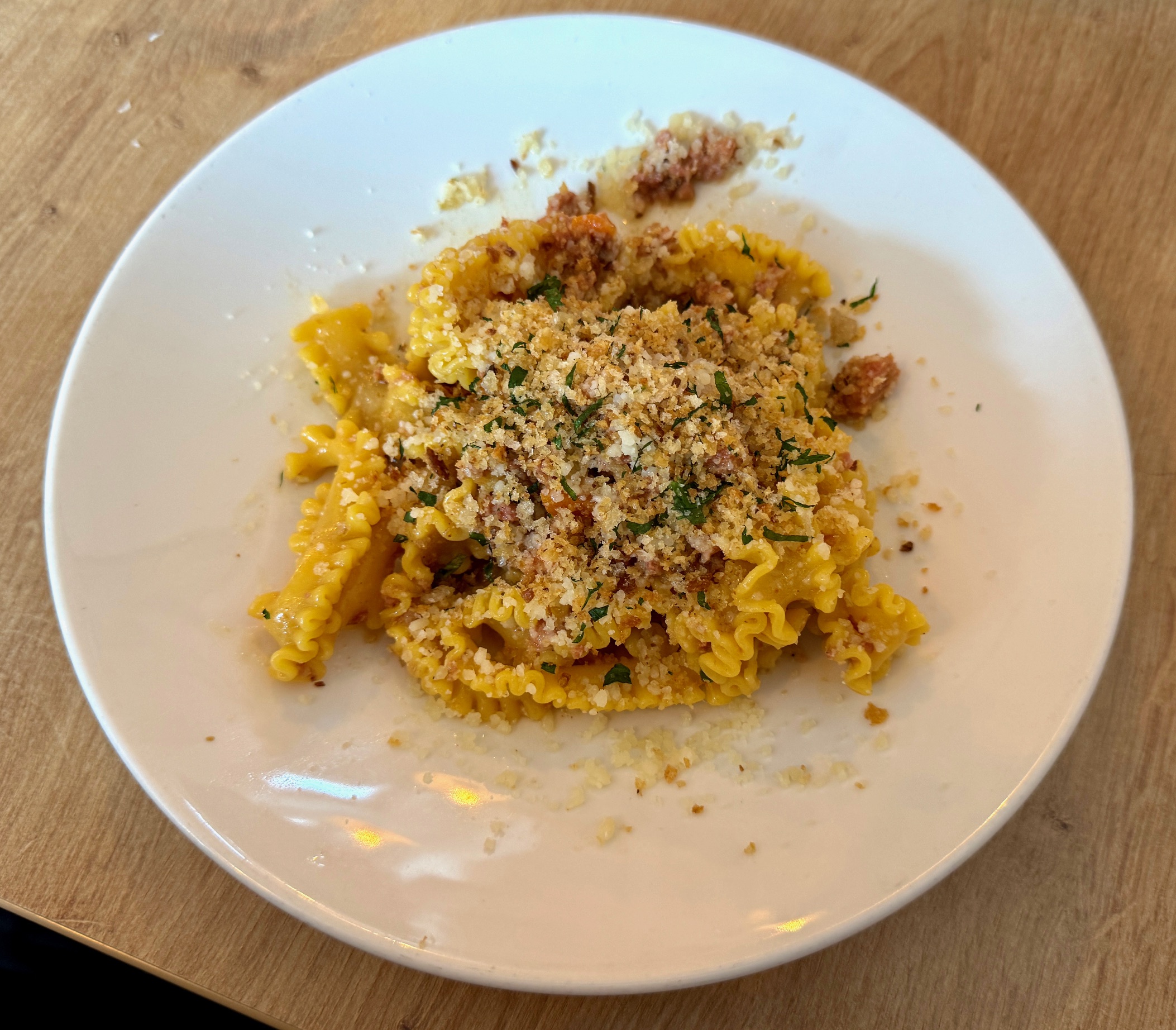 The dish that had jumped out of the menu for me, naturally, was the one Zoë chose. Mafalde are pasta ribbons with wavy, crinkly edges – “like an octopus tentacle” was Zoë’s description – and Little Hollows served them with a ragu of pork and fennel sausage, parmesan and pangrattato. This was right up my alley, and a mouthful just confirmed how good it was – the fennel seeds lent an aromatic crunch, as did the breadcrumbs, and the sausage and parmesan gave it an intense saltiness.