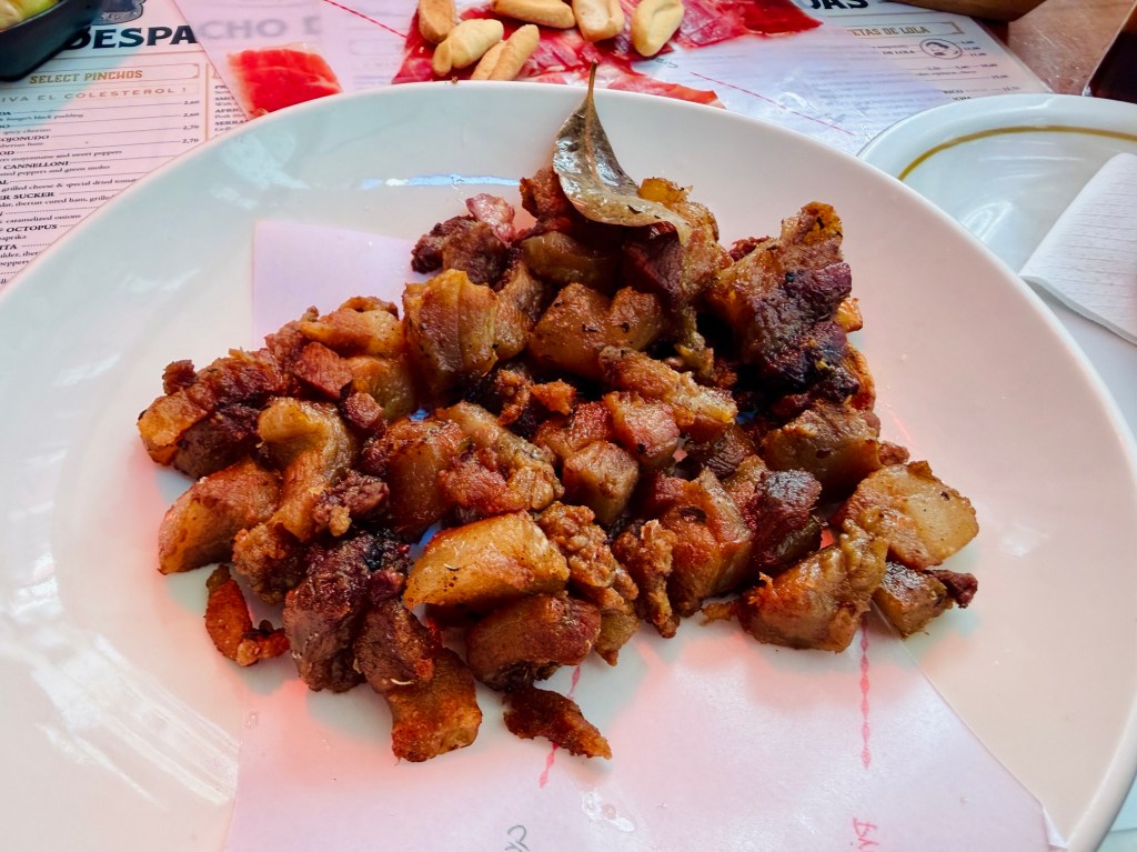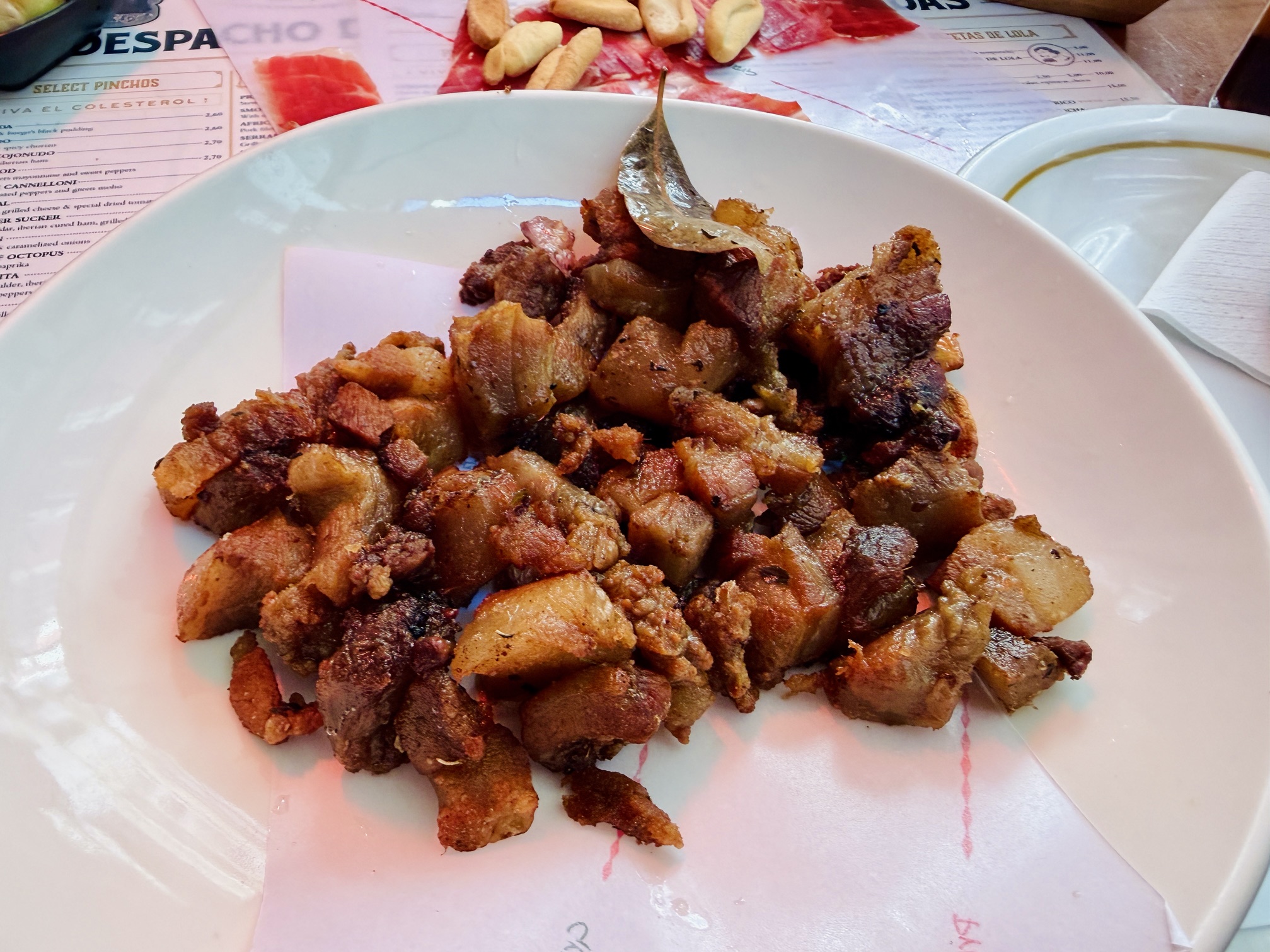 It has become a tradition for me to go there on every trip, usually at the start of my first day in the city, and invariably I order some beautiful ham and a cold vermouth (they do one, chispazo, with Coke which I like even though I probably shouldn’t) and a selection of pintxos topped with prawns, salt cod or morcilla. But I also make sure I order the chicharrones fritos, cubes of deep fried pork belly which are simply a plate of salty heaven. They also do, to my surprise, some of the best croquetas I’ve had on any trip.