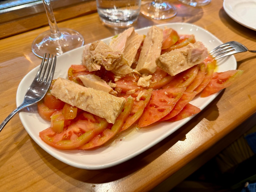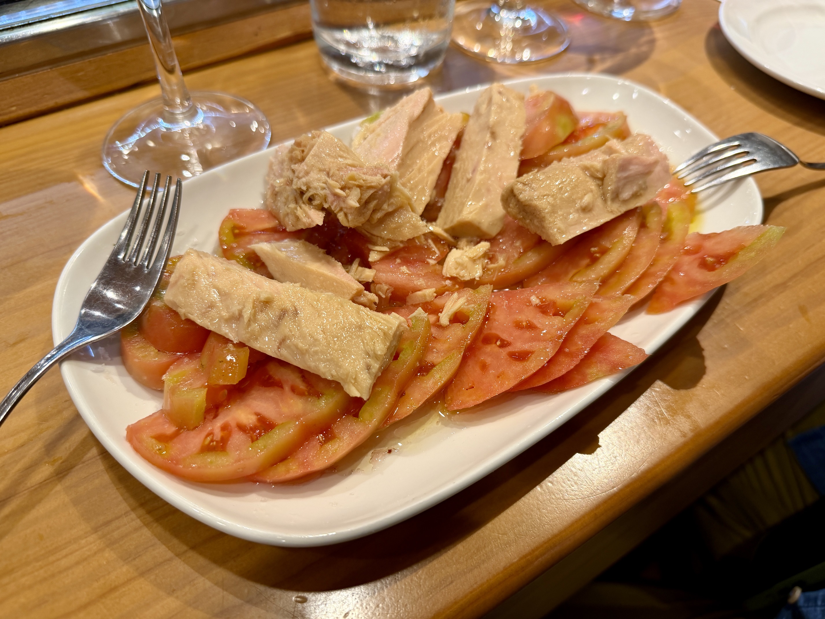 Towards the end of one meal there, I saw one of the men behind the bar, with great solemnity and ceremony, preparing a dish I wish I’d ordered. First he expertly chopped an enormous, bulbous tomato into chunks. Then he opened a jar of high grade Ortiz tuna, easing out the pieces and resting them on the tomato. He anointed the whole lot with good quality extra virgin olive oil, for about a full minute after the point where I thought surely he’ll stop now. Then he sprinkled salt, again for longer than I expected. When the dish was served up to some lucky diners I was tempted to applaud. Naturally, the next time I went I ate it.
