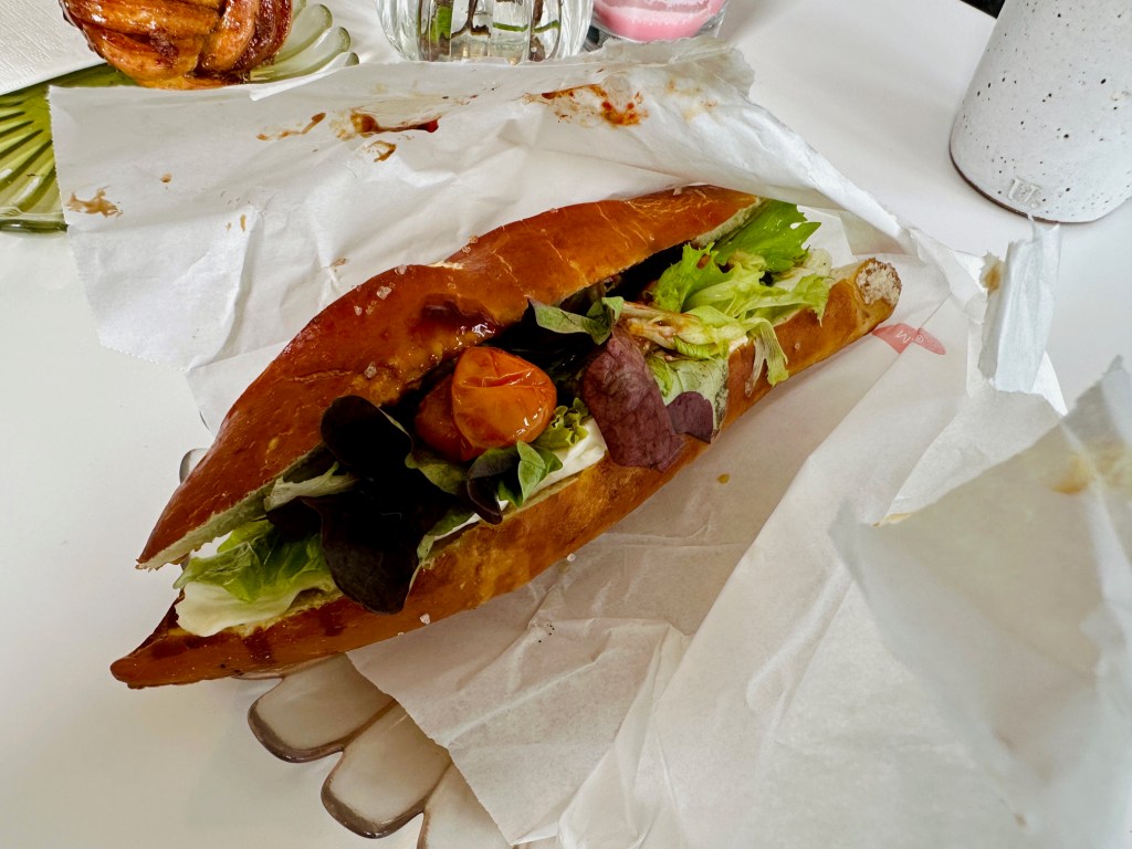 Here it was its best self, and it came with gorgeous cherry tomatoes, red and yellow bombs of sweetness, some salad and a glug of balsamic vinegar which transformed it from components to a composition. But the thing I liked best of all about this sandwich, and there was plenty to choose from, is that the bread was the star of the show. It was a long, thin pretzel roll with that distinctive taste, the slightly glazed exterior and little salt crystals. It had the structure to stand up to all the goodies that had been put in it, not dry, not mushy from the balsamic, a great roll in harmony with a great filling.